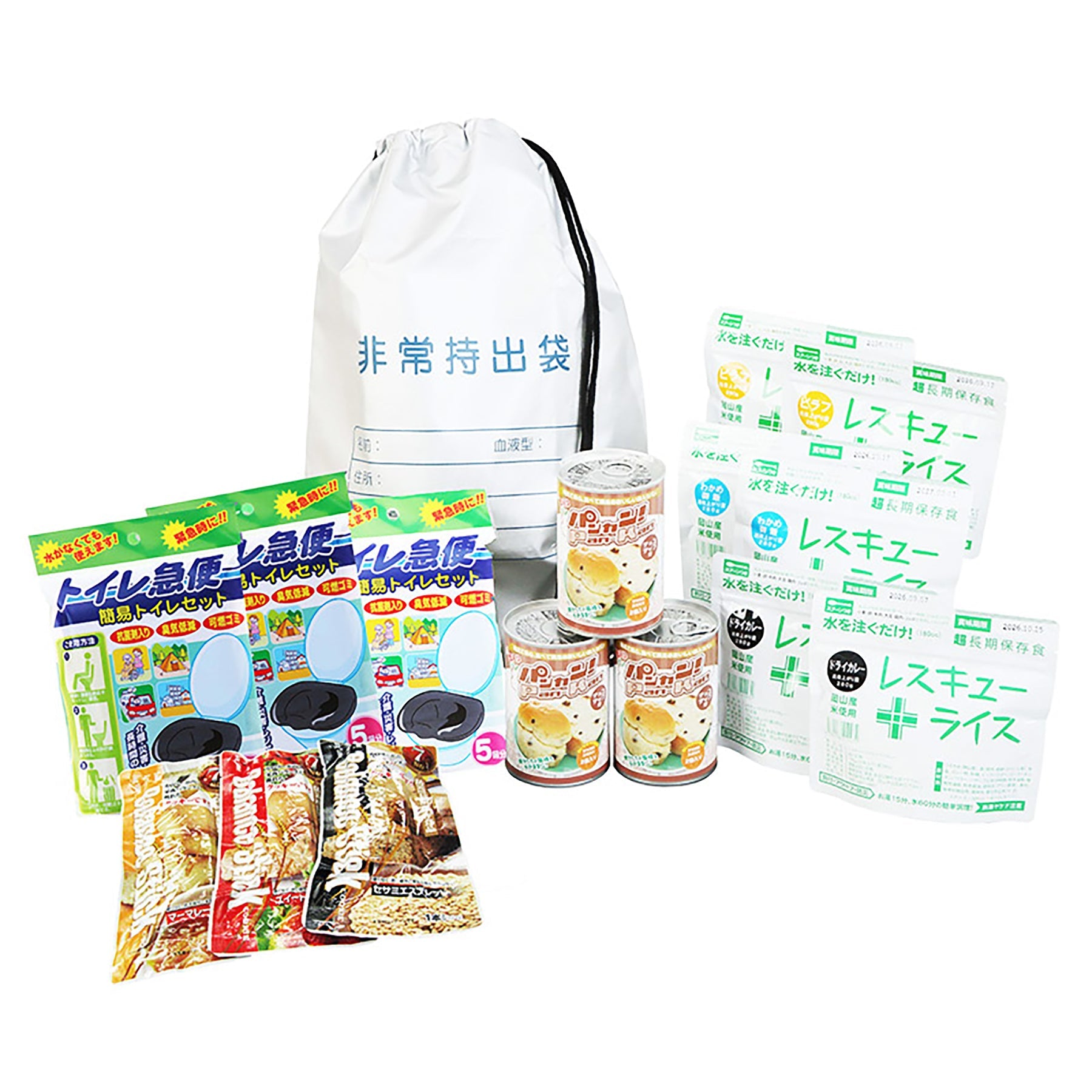 レスキューライス·わかめ御飯×2袋、レスキューライス·ドライカレー×2袋、レスキューライス·ピラフ×2袋、バランススティック·セサミエスプレッソ×1袋、バランススティック·スイートストロベリー×1袋、バランススティック·マーマレードチーズ×1袋、缶入パンチョコチップ×3缶、簡易トイレ5回分×3袋、非常持出袋シルバーナップサック×1枚 |