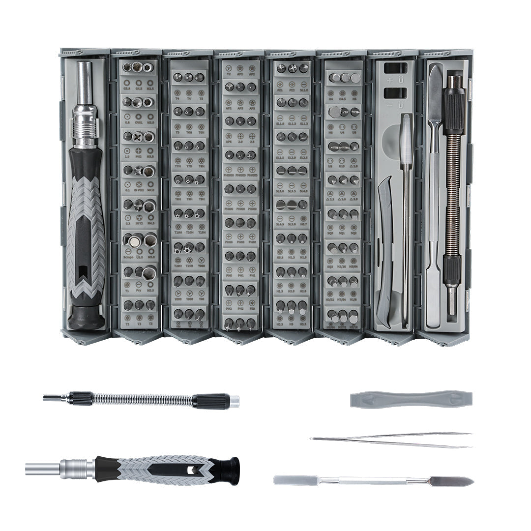 | 126種類のビットがぎっしり。この1セットでDIYも電子機器修理も楽しめちゃう! コンパクトで収納力抜群だから、いつでもどこでも使えるね。初心者さんもプロも大満足! |