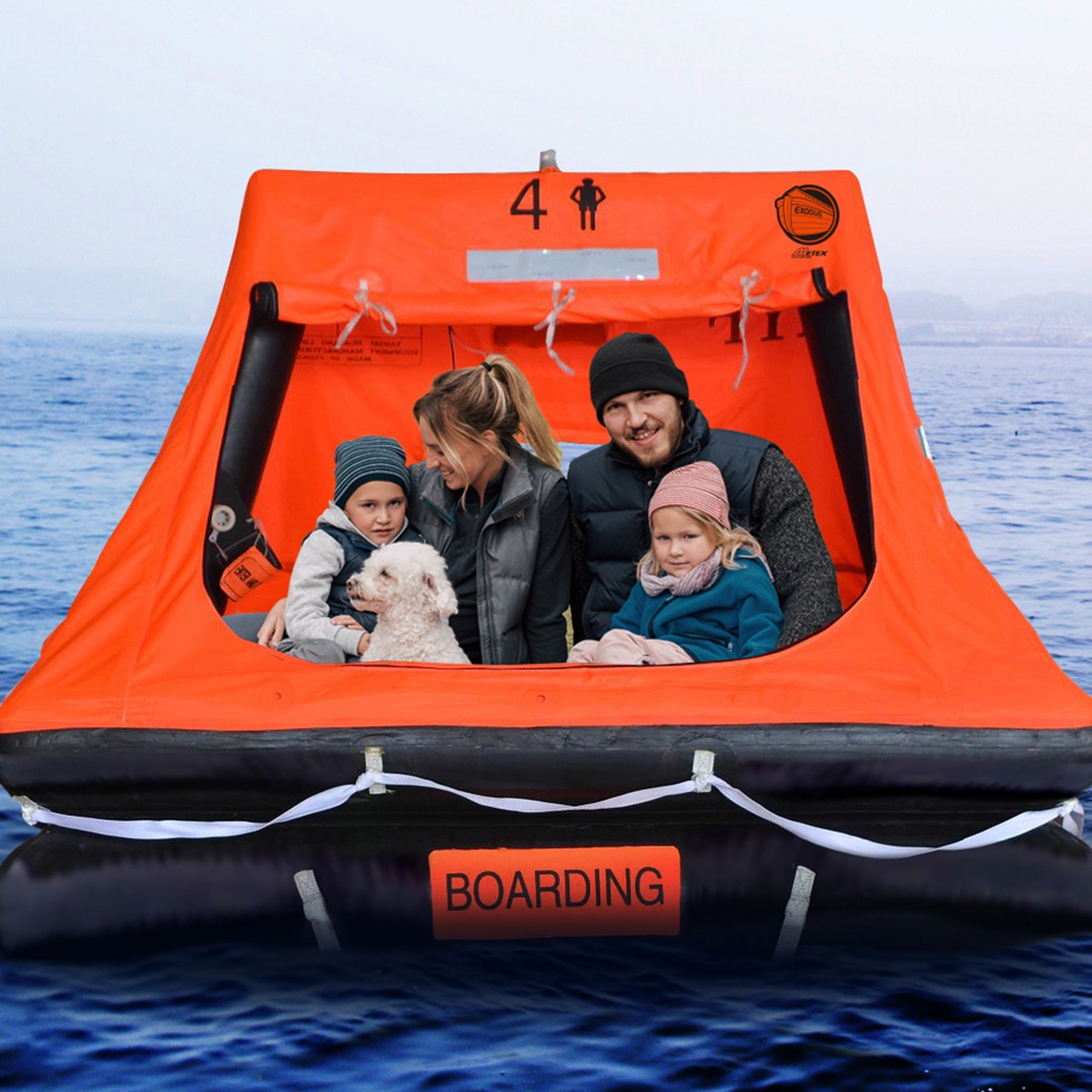 ●救命いかだ4人用キャリーバッグタイプは、ひもを引くだけでわずか2分、4人乗りの水に浮く救命いかだが出来上がります。
