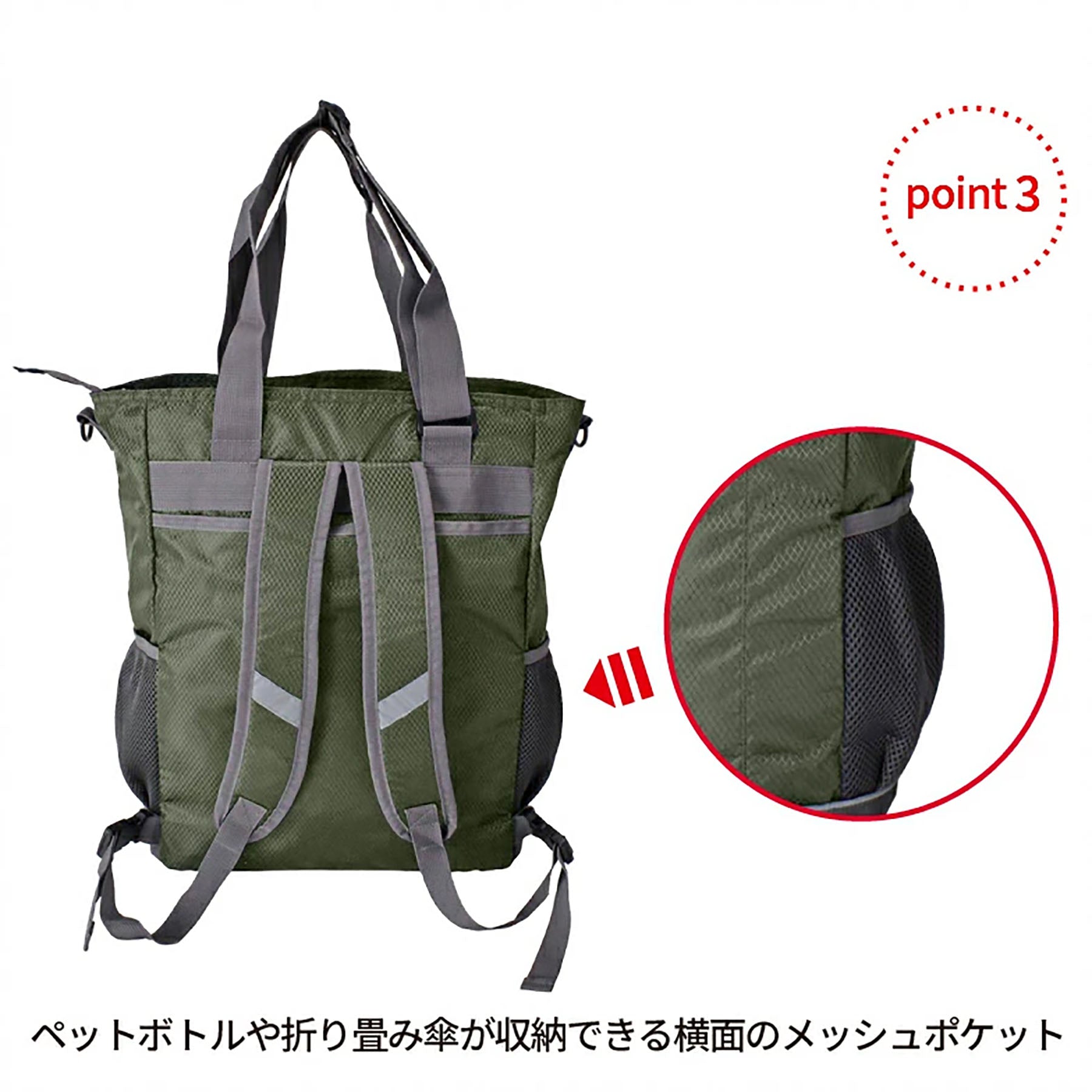 ●両サイドのメッシュポケットは500mlのペットボトルや折り畳み傘を入れても便利です。