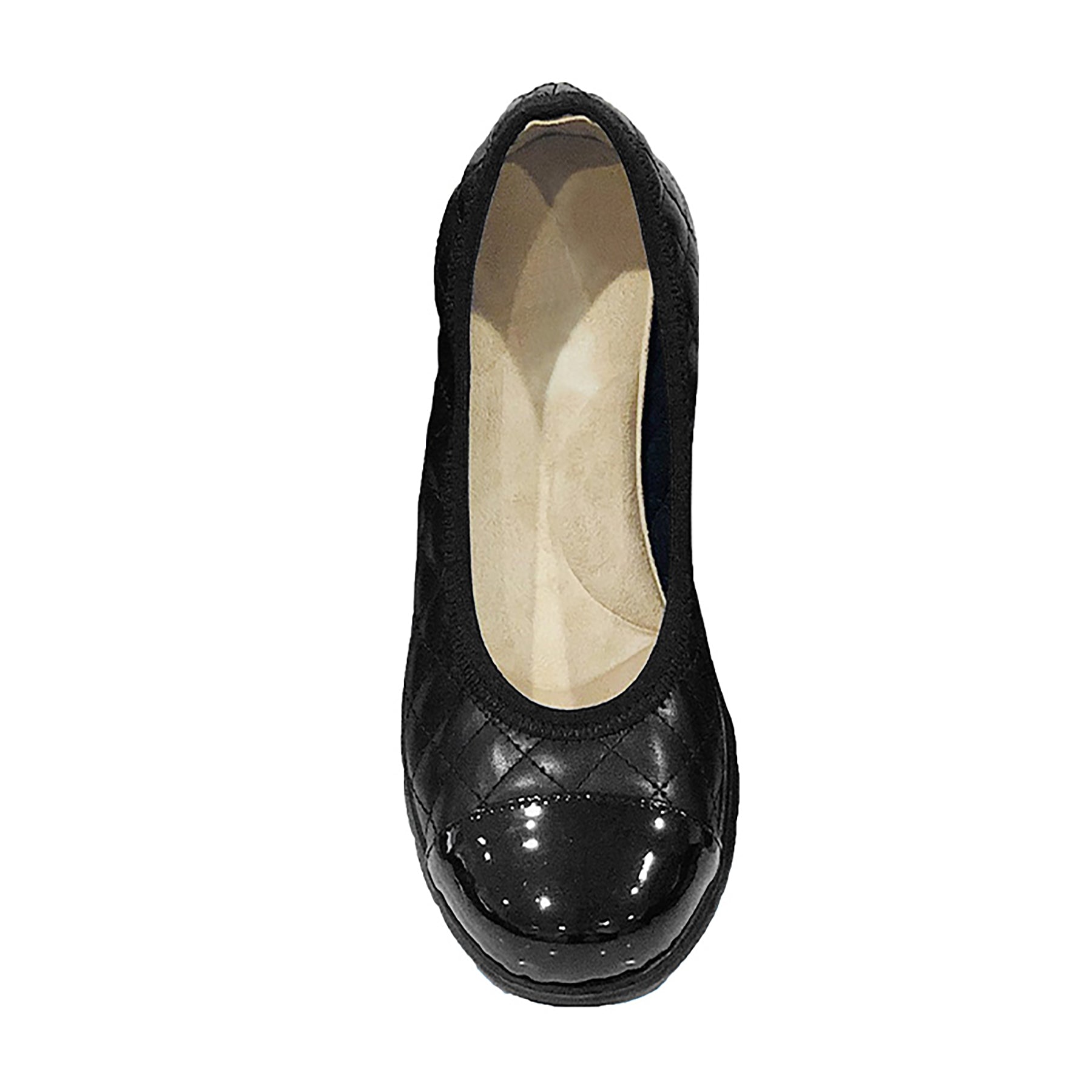 ●ほのかな光沢×エナメルコンビのアッパーにキルティングを施し、女性らしい華やかさを演出します。