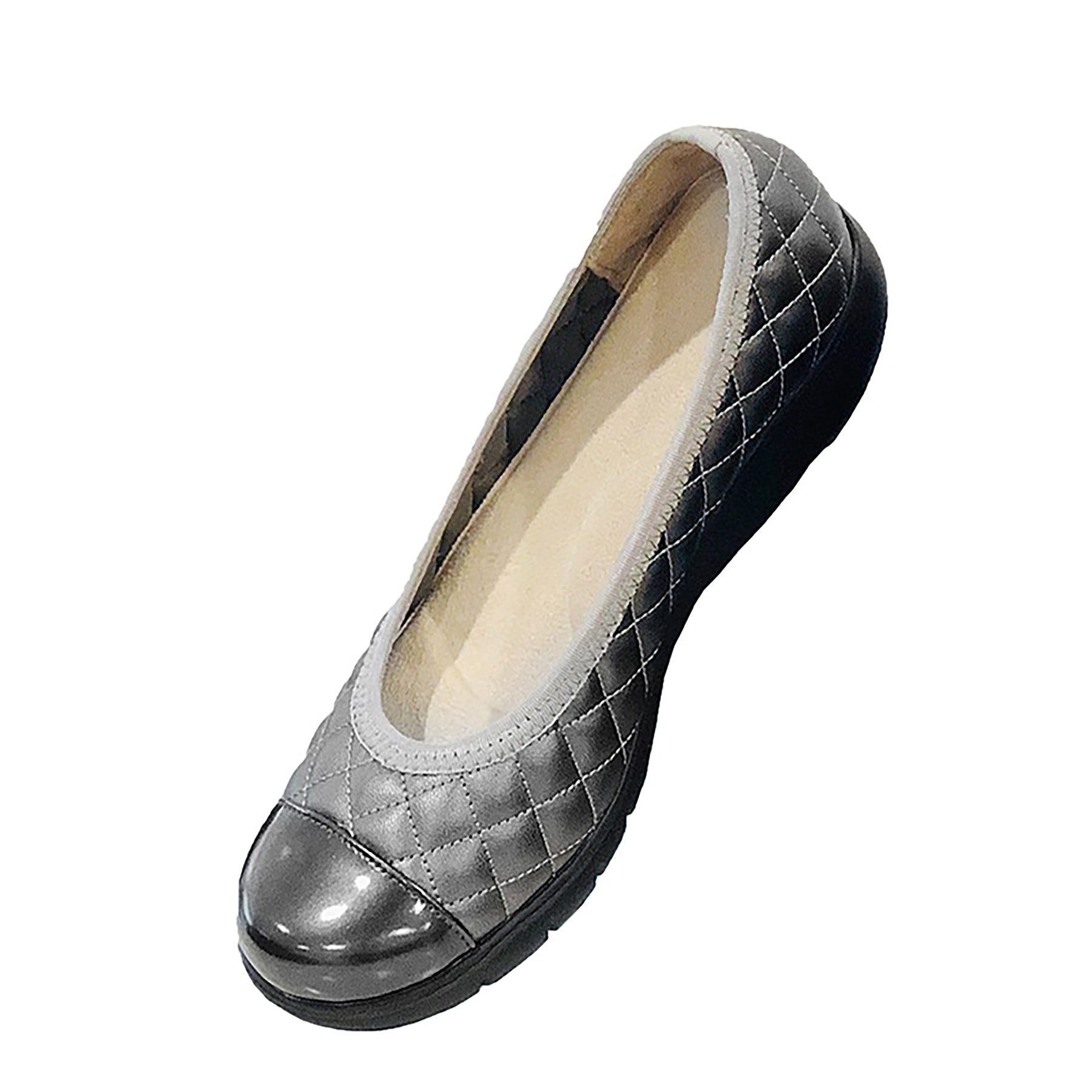 ●ほのかな光沢×エナメルコンビのアッパーにキルティングを施し、女性らしい華やかさを演出します。
