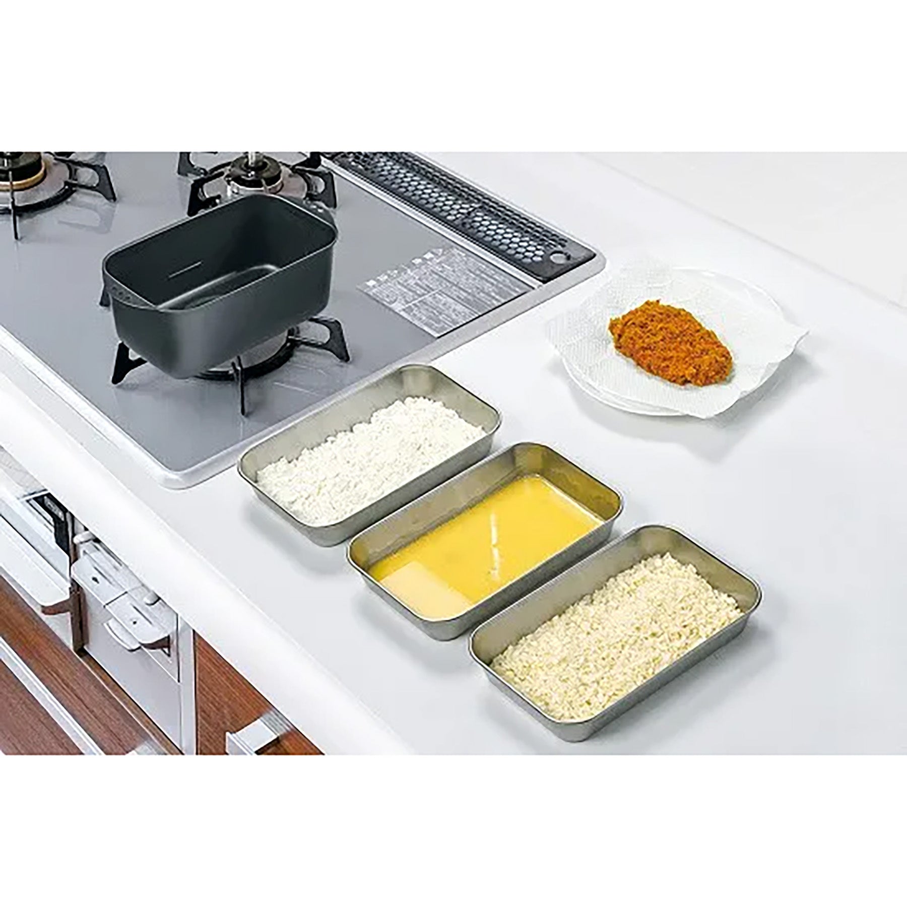 ●バットが3枚あるのでそれぞれに卵、小麦粉、パン粉を入れ天ぷらが調理出来ます。