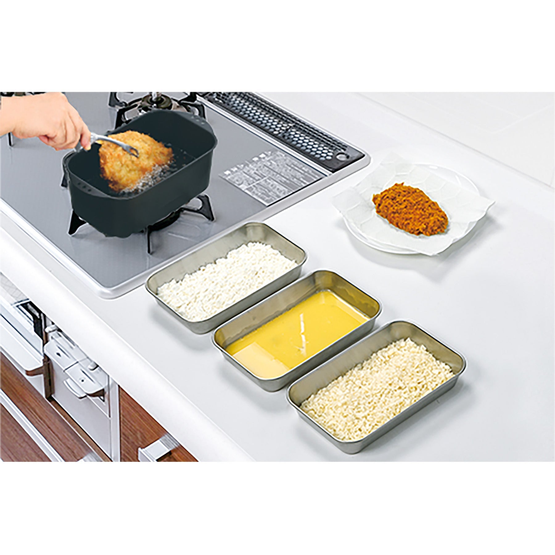 ●バットが3枚あるのでそれぞれに卵、小麦粉、パン粉を入れ天ぷらが調理出来ます。