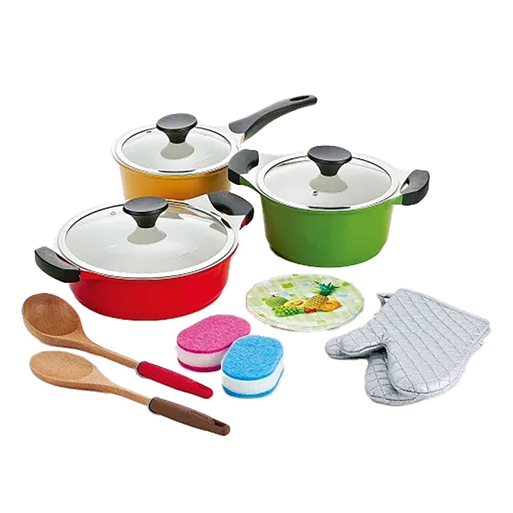 片手鍋18cm、両手鍋20cm、お玉、ヘラ、網敷き、ミトン、スポンジ |