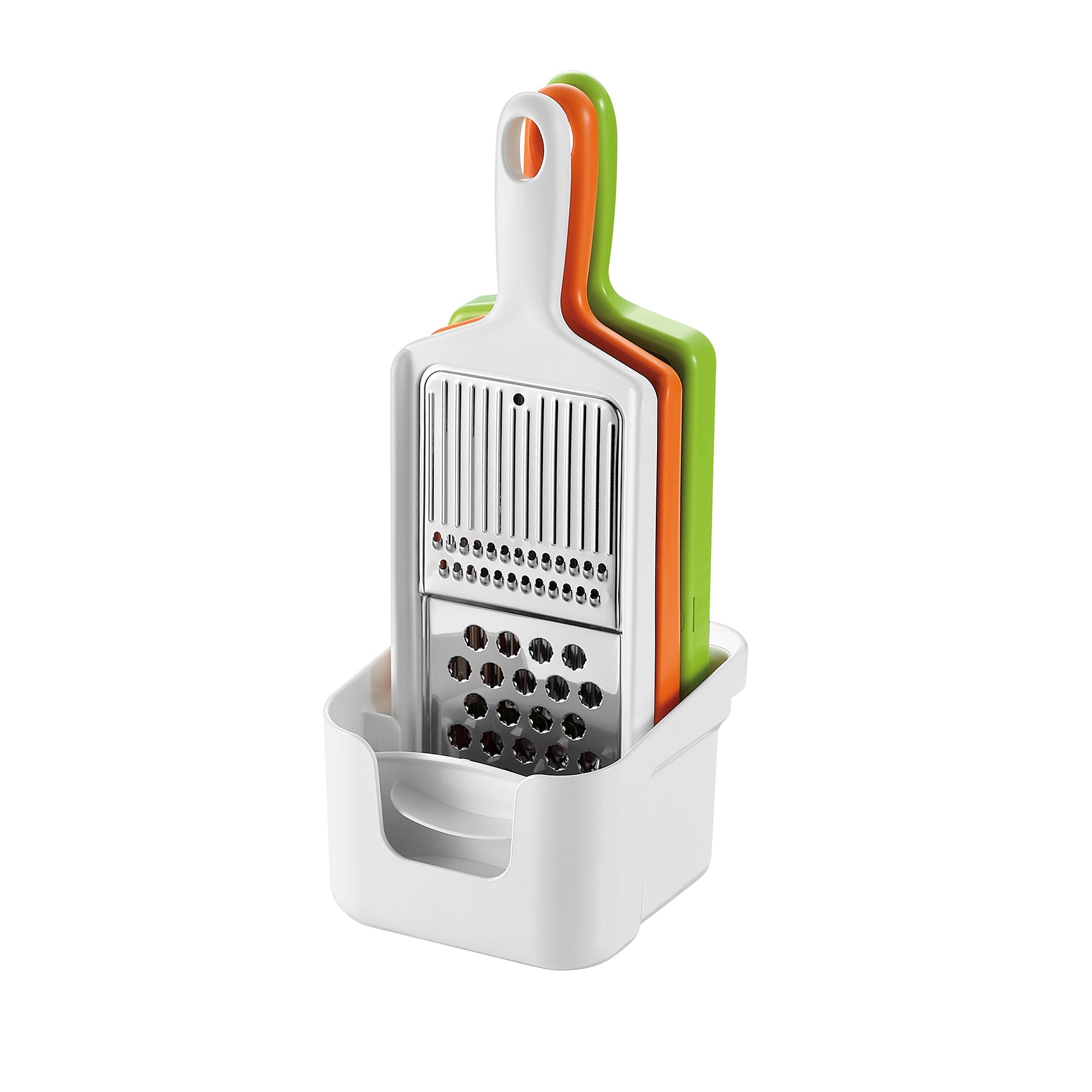 ●ツマ切り・おろし・千切り・しりしり・スライス5種類の下ごしらえができます。出し入れ楽々のスタンド収納です。