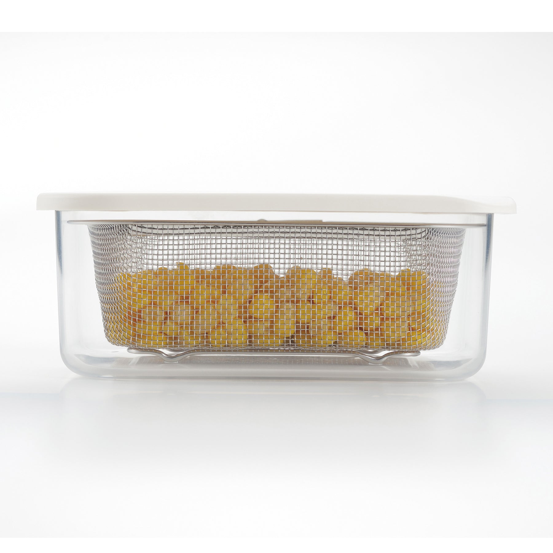 ●レンジコンテナ ザル付きは、蓋をしたまま電子レンジの使用が可能なコンテナです。