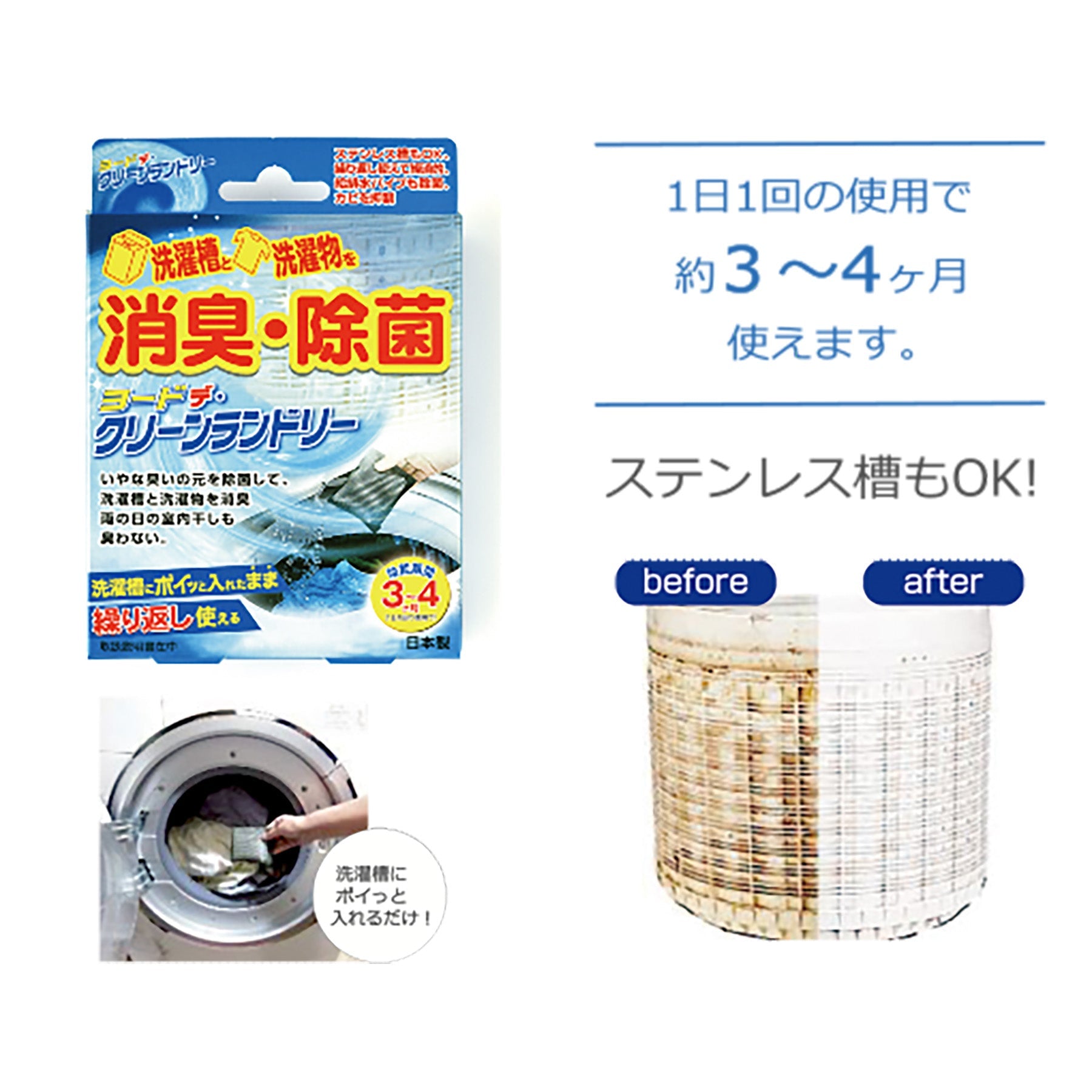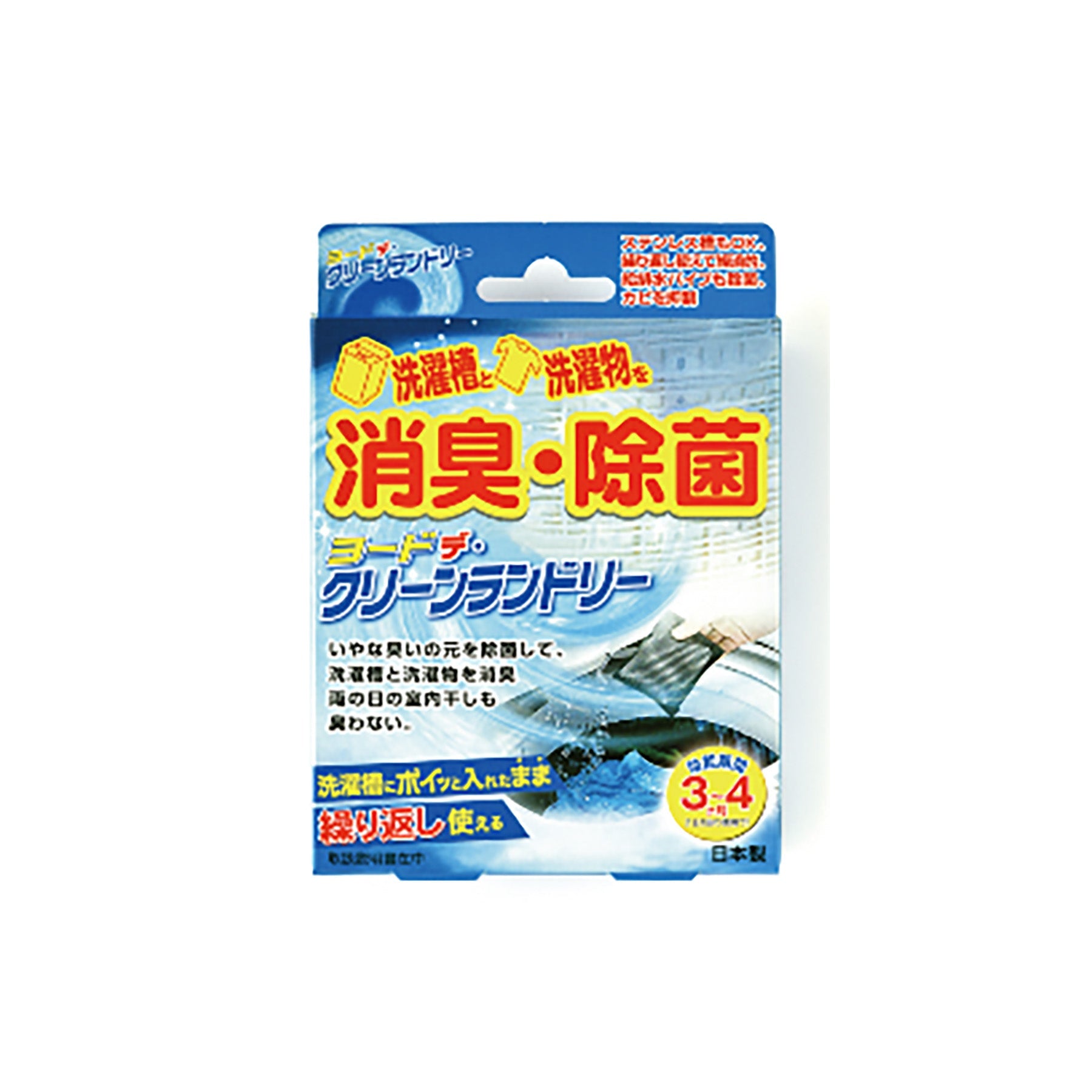 ●ヨードデ・クリーンランドリーは、洗濯槽にポイっと入れるだけで洗濯槽・洗濯物の除菌・消臭ができる商品です。