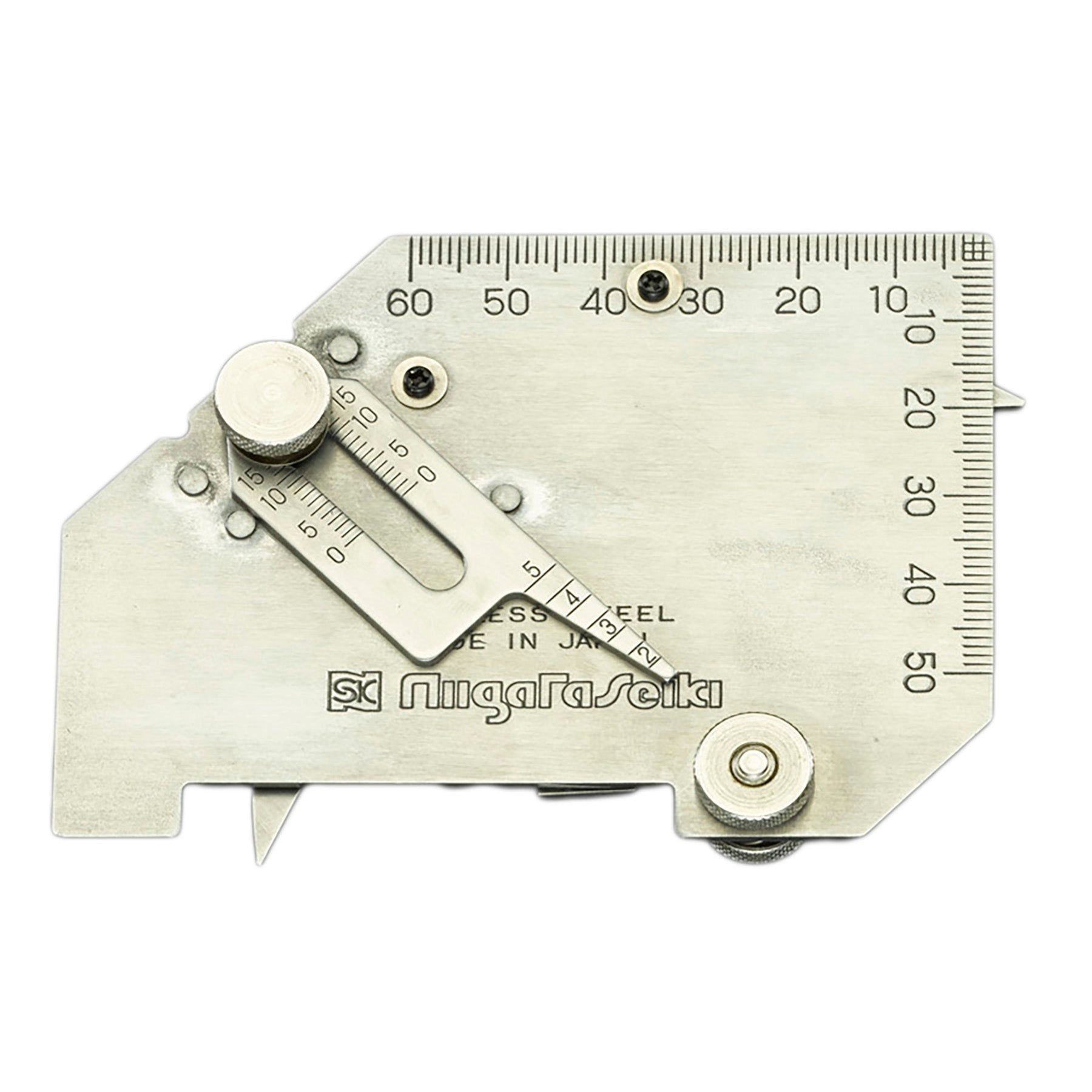 本体直尺目盛:50・60mm 余盛高さ:25mm すみ肉脚長:25mm すみ肉のど厚:15mm アンダーカット深度:25mm ルート間隔:2~5mm 開先(ベベル)角度:0~60°(最小読取値:5°) |