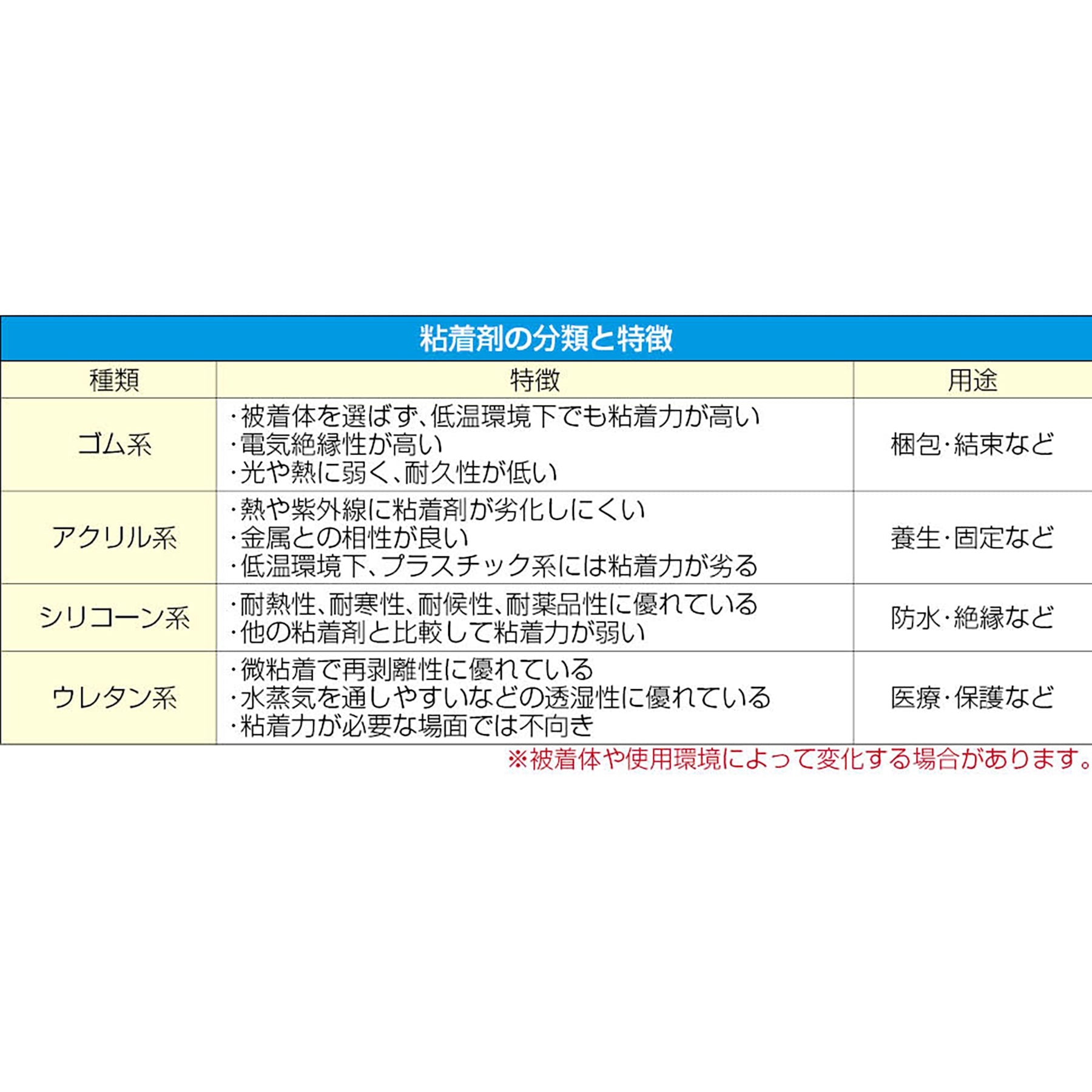 使用する表面の材質と用途に応じて選ぶことが重要です。例えば、粗面には粘着力が強めのテープを、デリケートな表面には粘着力が弱めのテープを選びます。また、テープが簡単に手で切れるかどうかもチェックポイントです。