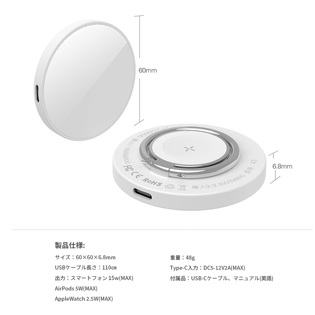 電源アダプターは付属しません。本製品はMagsafe規格の15Wに対応致しません。iPhoneの最大出力は7.5W-10W程度になります。Samsung S21などの高速充電対応機種では15W出力されます。革製のiPhoneケースをご利用の場合、ケースに円型の跡が残る場合があるので、ご注意ください。MagSafe対応のiPhoneケースでのご利用またはケースを外してのご利用を推奨致します。Magsafe非対応のiPhoneケースを使用した場合は磁石の吸着が弱くなります。金属製や磁気を帯びたケースおよびクレジットカード、厚みのあるケースは充電前に取り外してください。MagSafe充電対応:iPhone12、iPhone 13、iPhone 14シリーズ、Qi対応機器:iPhone 11シリーズ、iPhone 8、iPhone X、iPhone XS、iPhone XR、iPhone SE(第2世代)AirPods: AirPods Pro / Wireless AirPods 2 Case (2019) Apple Watch Series 3/4/5/6/SE/7/8/ultra、Qi対応Androidスマートフォン |