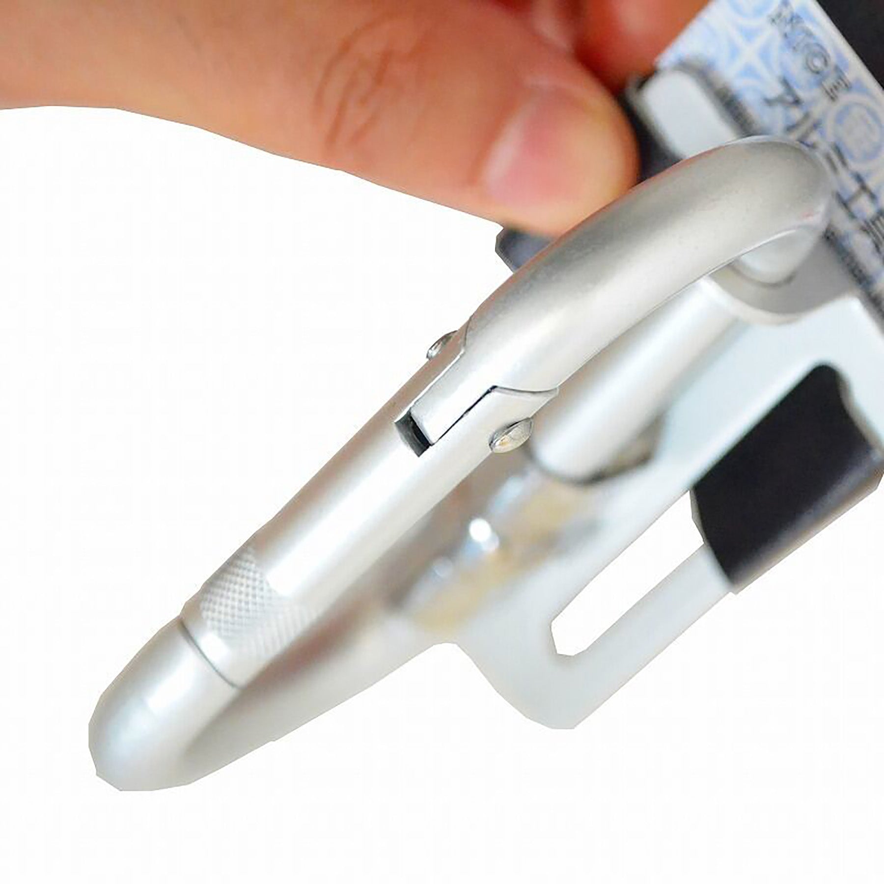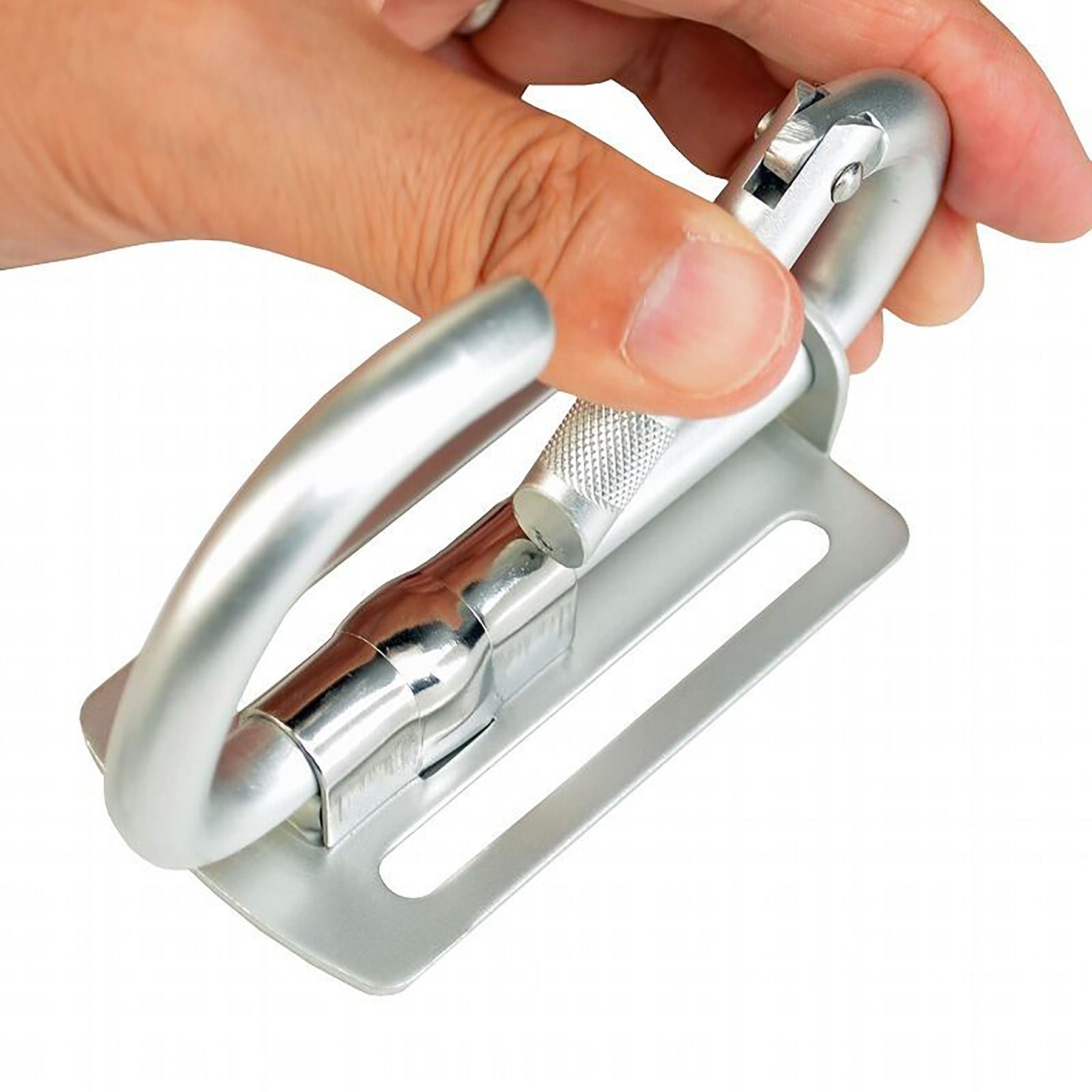 カラビナ部分を左右に倒せる可倒式で、使用しないときはたたんでコンパクトに収納でき、使用時はカラビナの可動部がぐらつきにくい造りです。