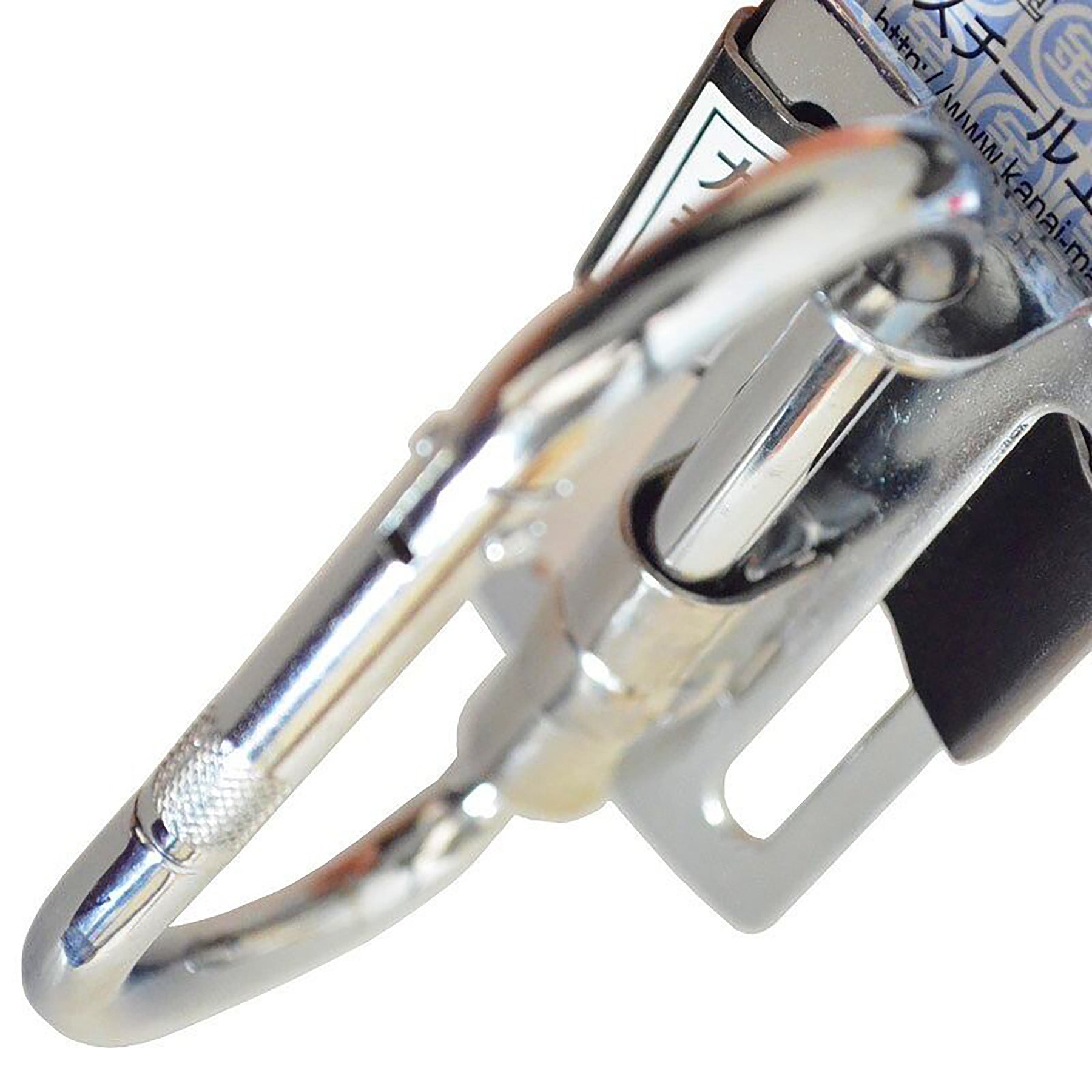 カラビナ部分を左右に倒せる可倒式で、使用しないときはたたんでコンパクトに収納でき、使用時はカラビナが中央部でホールドされ、可動部のぐらつきを防ぎます。