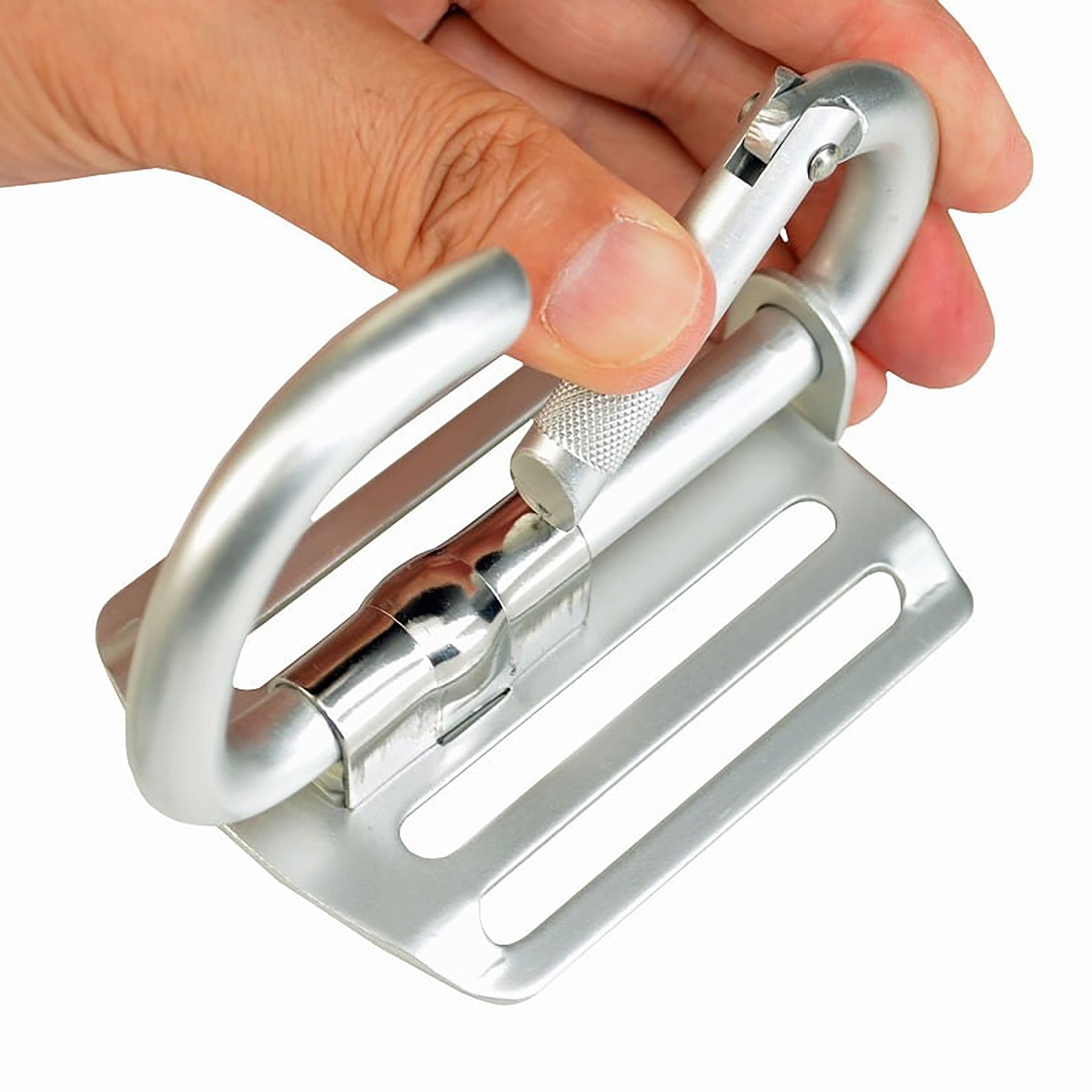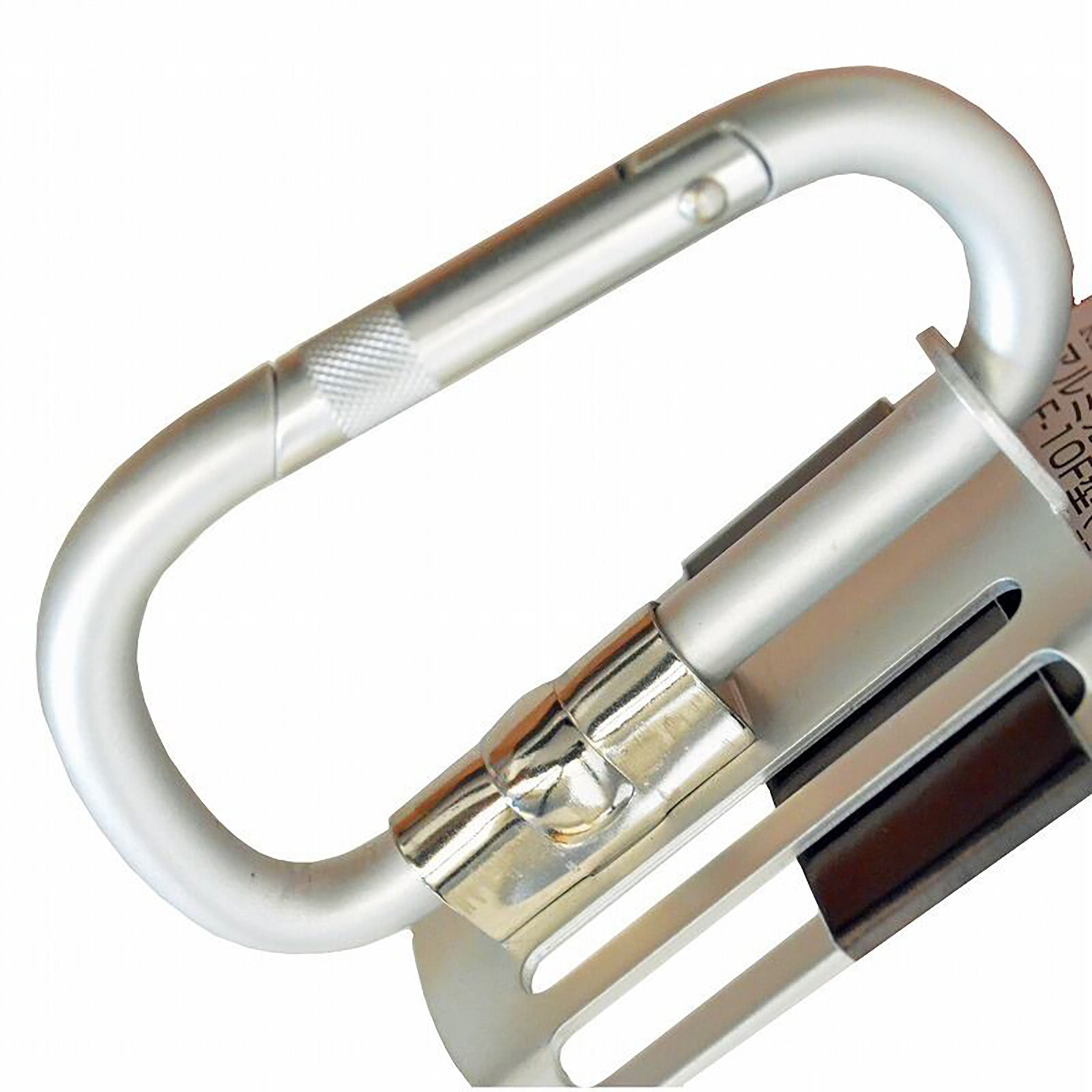 カラビナ部分を左右に倒せる可倒式で、使用しないときはたたんでコンパクトに収納でき、使用時はカラビナが中央部でホールドされ、可動部のぐらつきを防ぎます。