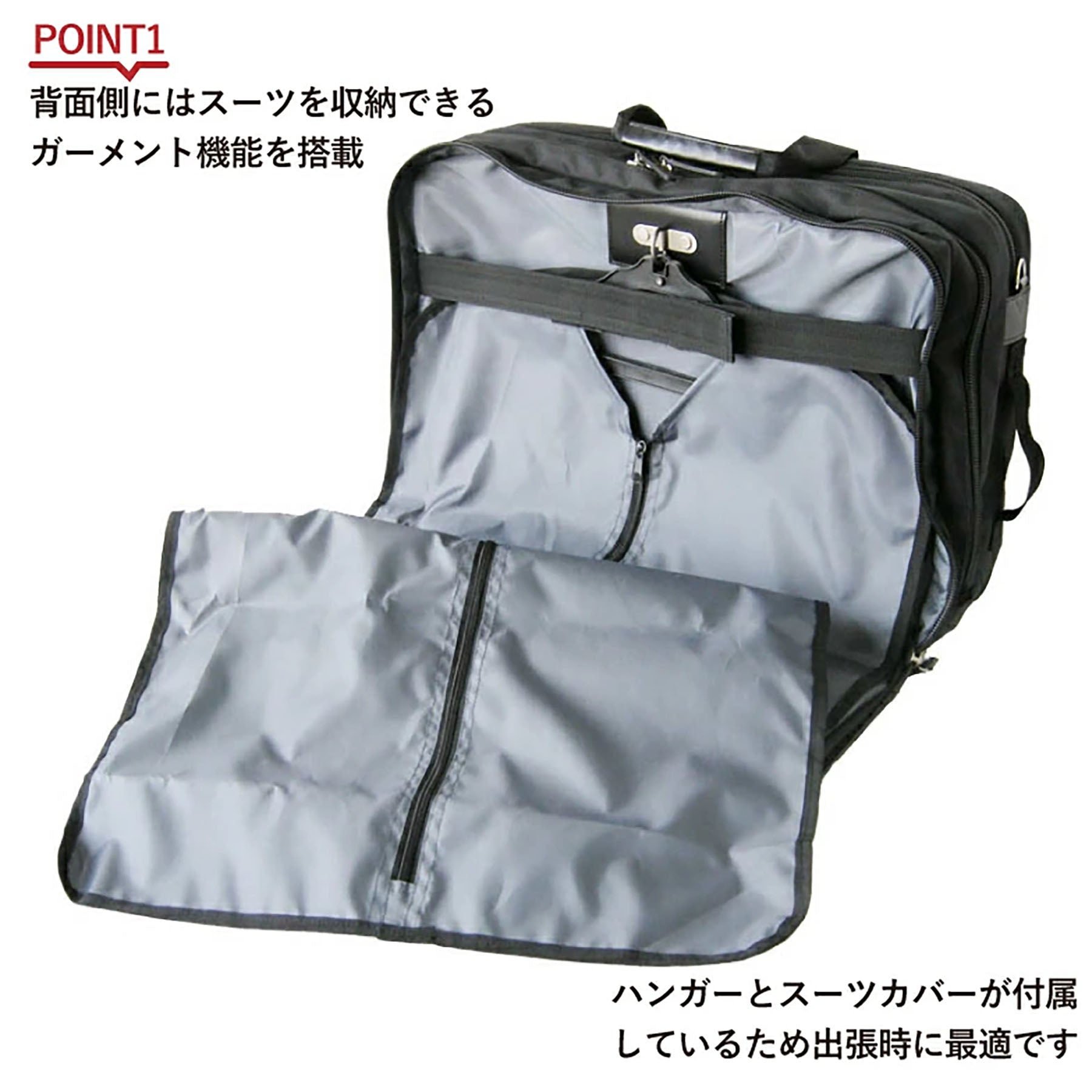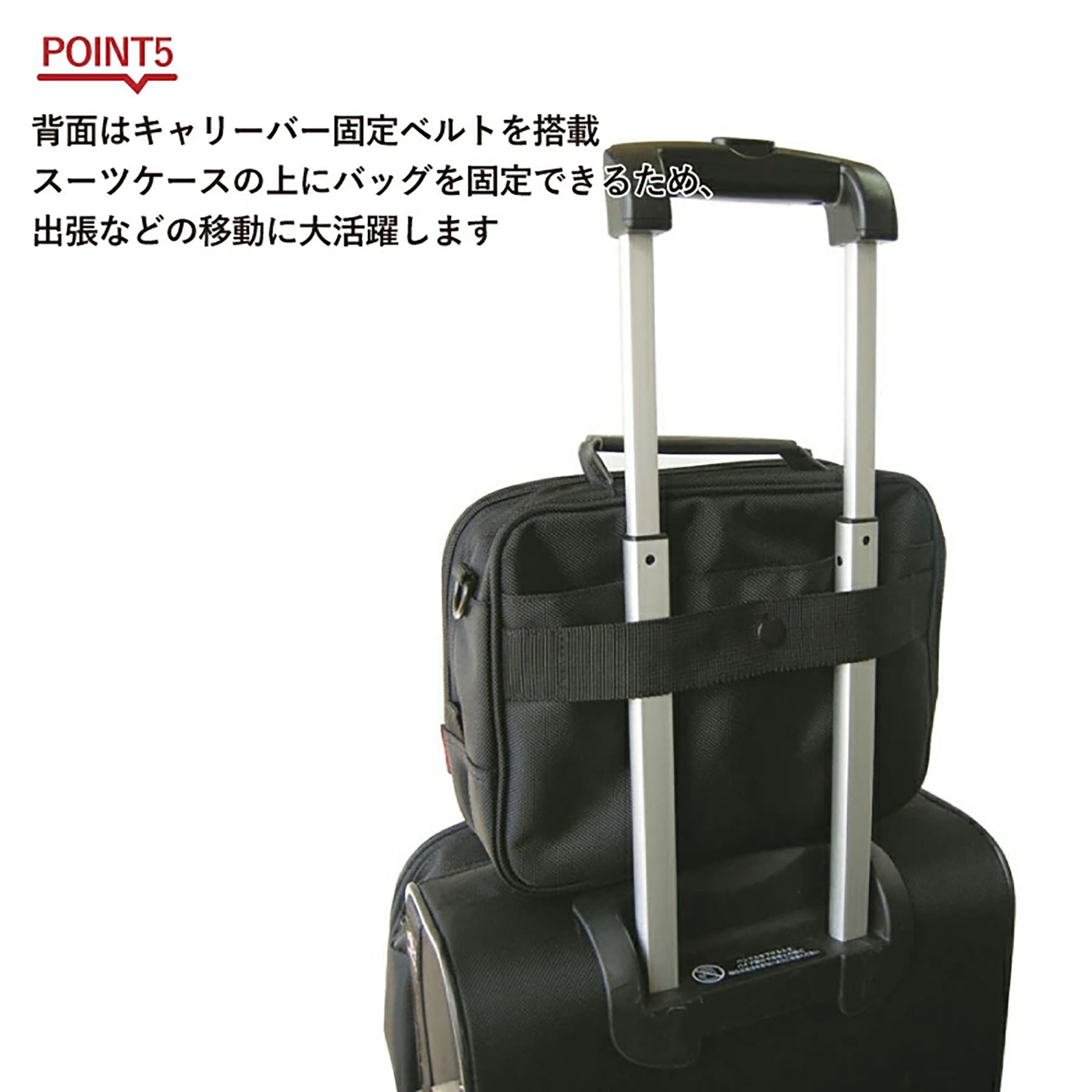 背面はキャリーバー固定ベルトを搭載しているのでスーツケースの上にバッグを固定できるため、出張などの移動に大活躍です。