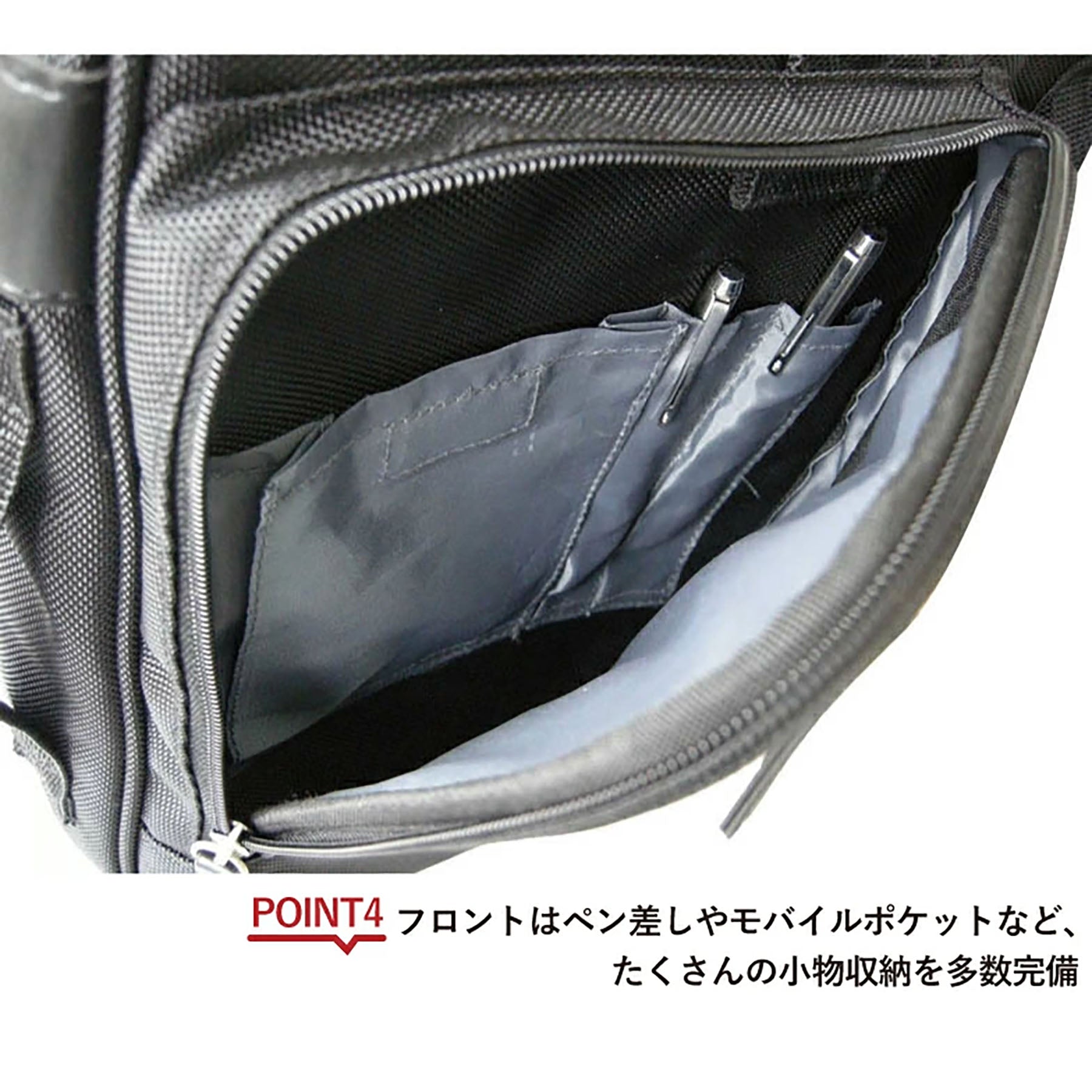 外側:ファスナーポケット×5、内側:ファスナーポケット×3、オープンポケット×7、PCポケット×1、、ペン差し×2、かぶせポケット×1、カード差し×2 |