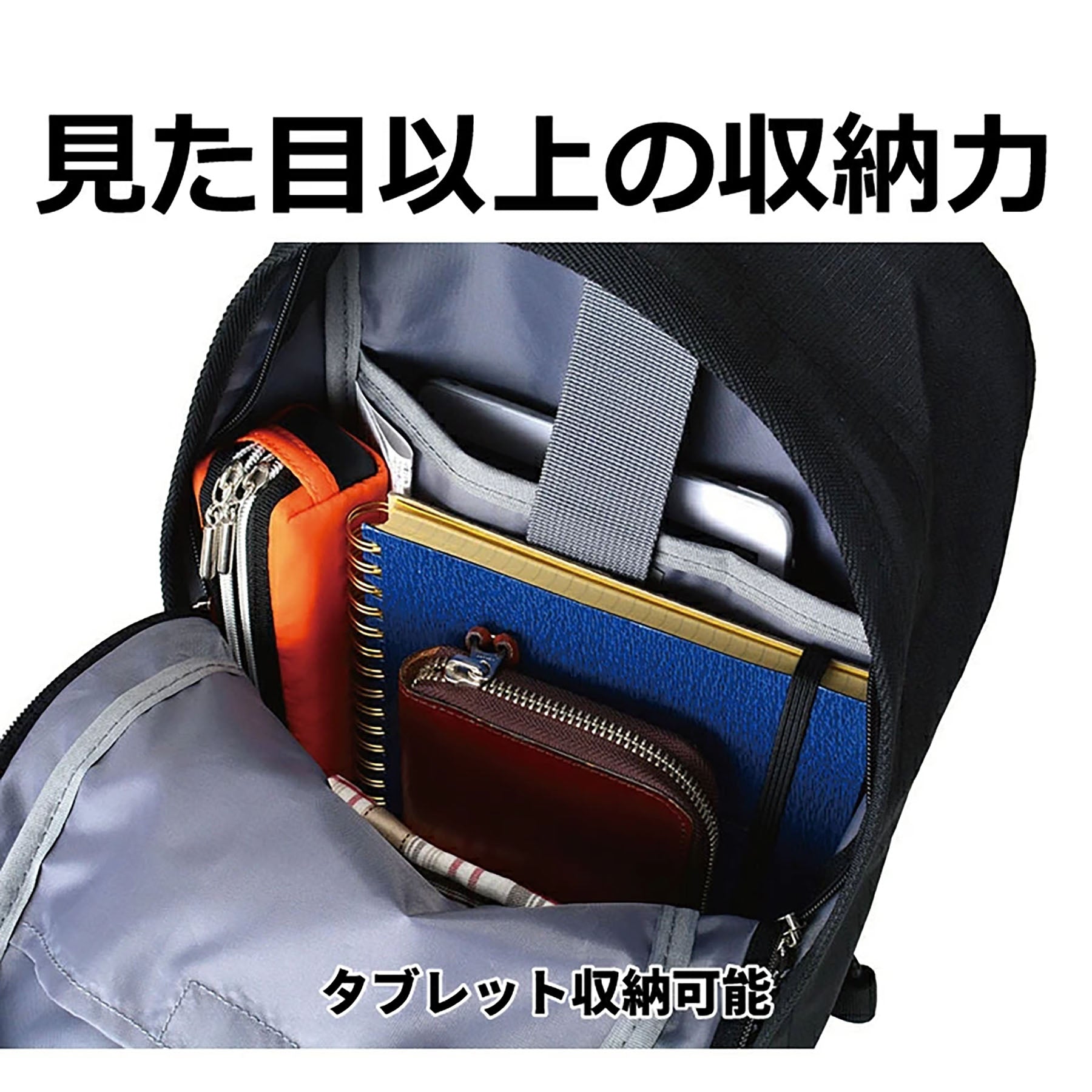 見た目以上の収納力でタブレット用(サイズによります)のポケットもあります。