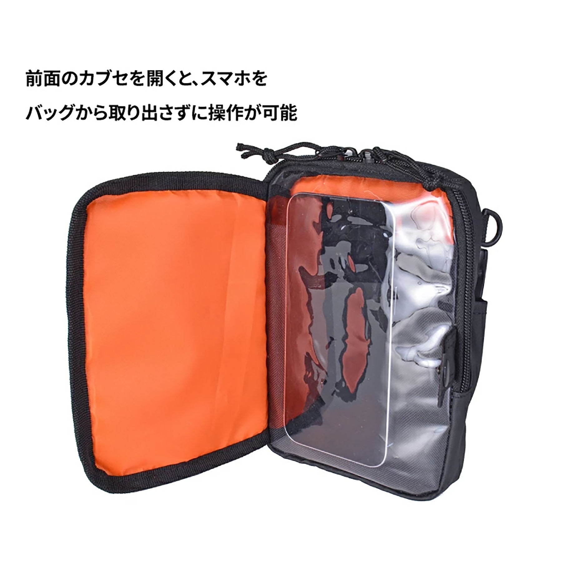 前面のカブセを開くと、スマホをバッグから取り出さずに操作が可能 ペンやメモ帳、スマホなど小物をまとめて収納が可能です。