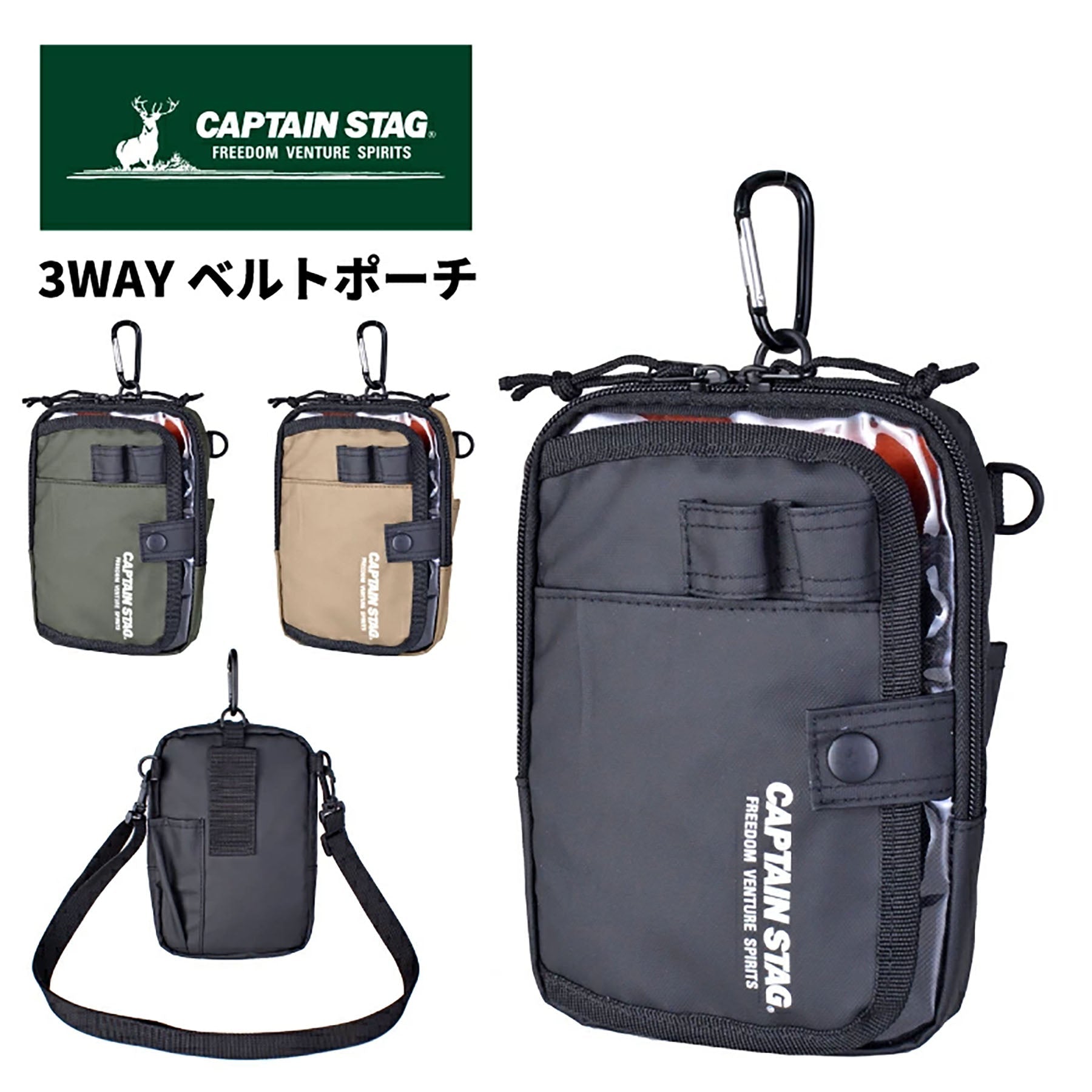 CAPTAIN STAG 3WAYショルダーバッグ 1335 キャプテンスタッグは、カラビナで引っかけたり、ショルダーベルトで肩からかけたりできる小物シリーズのベルトポーチです。