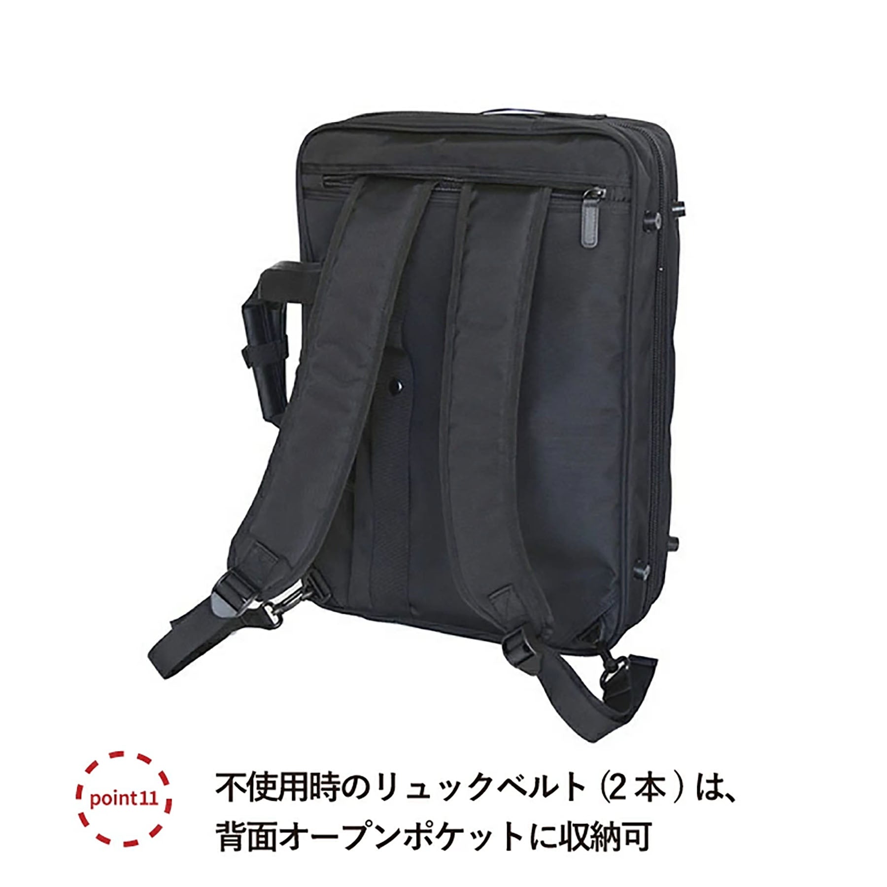 バッグ外:ファスナーポケット×3 バッグ内:オープンポケット×4、PCポケット×1、ペン差し×2、メッシュポケット×3、ファスナーポケット×1 |