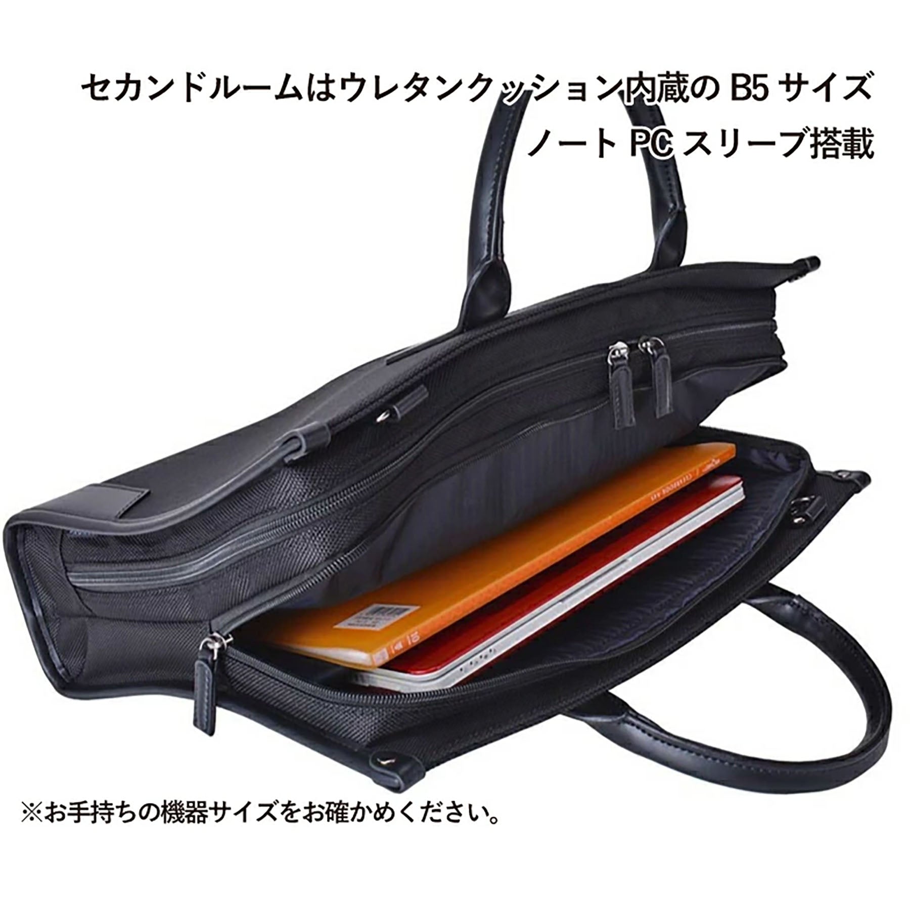 内部は小物収納に便利なオープンポケットとペン差し付きで背面にはウレタンクッション入りB5サイズPCルーム付きなので安心です。