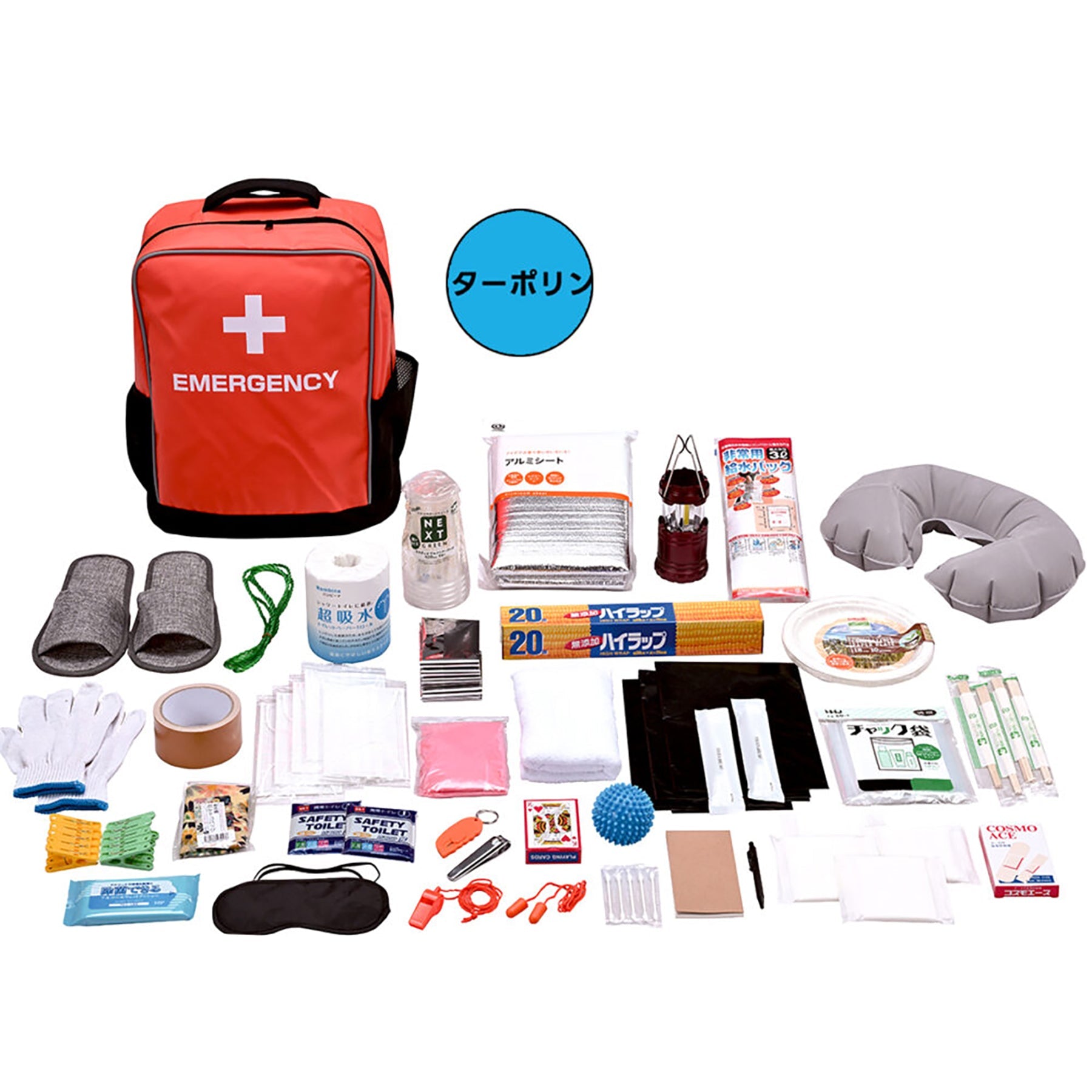 リュック本体、タンク、ラップ、紙皿10枚、割りばし4本、紙コップ5個、マッサージポール、トランプ、マスク5枚、ウェットティッシュ、簡易トイレ2個、トイレットペーパー1R、爪切り、絆創膏、歯ブラシ2本、綿棒5本、生理用品、アルミブランケット、レジャーアルミシート、ネックピロー、アイマスク、耳栓、レインコート、軍手、カッターナイフ、ロープ、タオル、チャック袋、スリッパ、ゴミ袋3枚、コンパクトバッグ、メモ帳、ボールペン、洗濯ばさみ、笛、ガムテープ、スライドランタン |