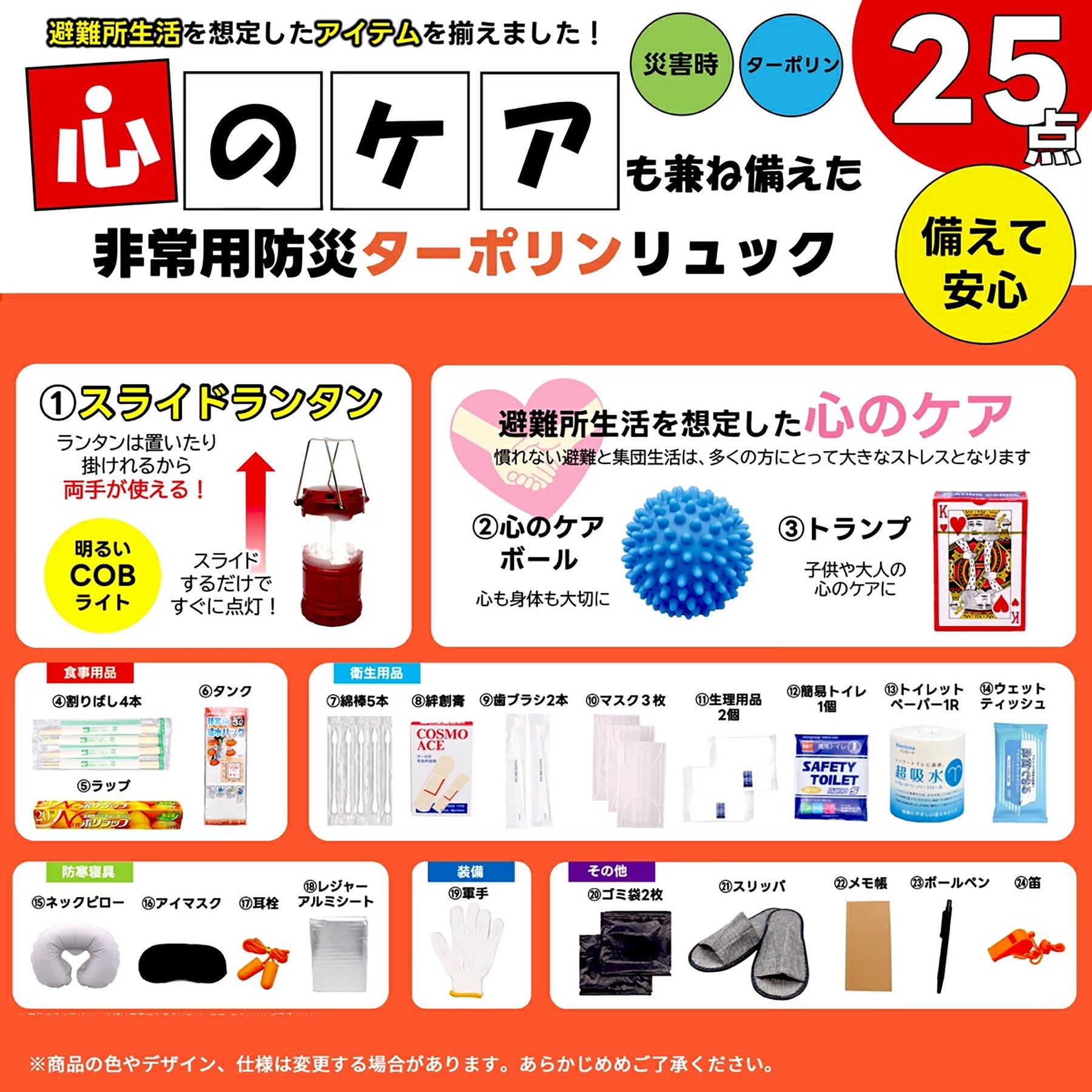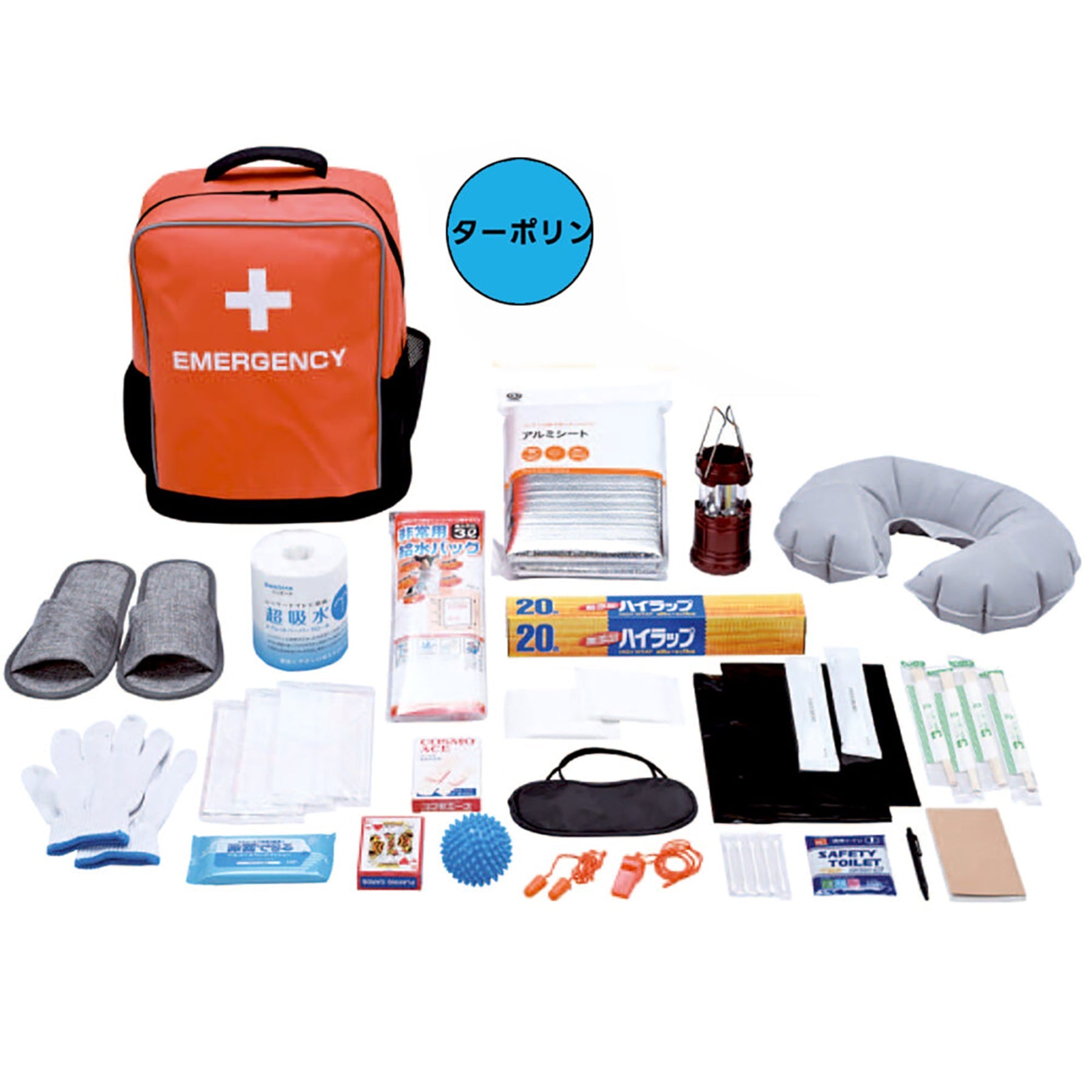 リュック本体、タンク、ラップ、割りばし4本、マッサージポール、トランプ、マスク3枚、ウェットティッシュ、簡易トイレ1個、トイレットペーパー1R、絆創膏、歯ブラシ2本、綿棒5本、生理用品、レジャーアルミシート、ネックピロー、アイマスク、耳栓、軍手、スリッパ、ゴミ袋2枚、メモ帳、ボールペン、笛、スライドランタン |