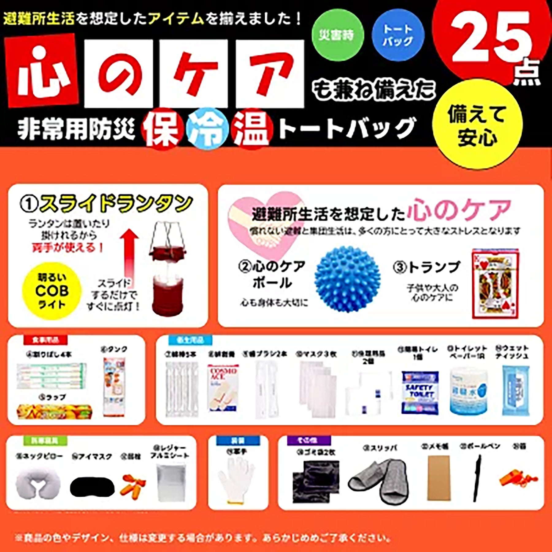 心のケア入り防災バッグ 25点(保冷保温トート)は、避難所生活を想定した心のケアも兼ね備えた厳選25点セットです。