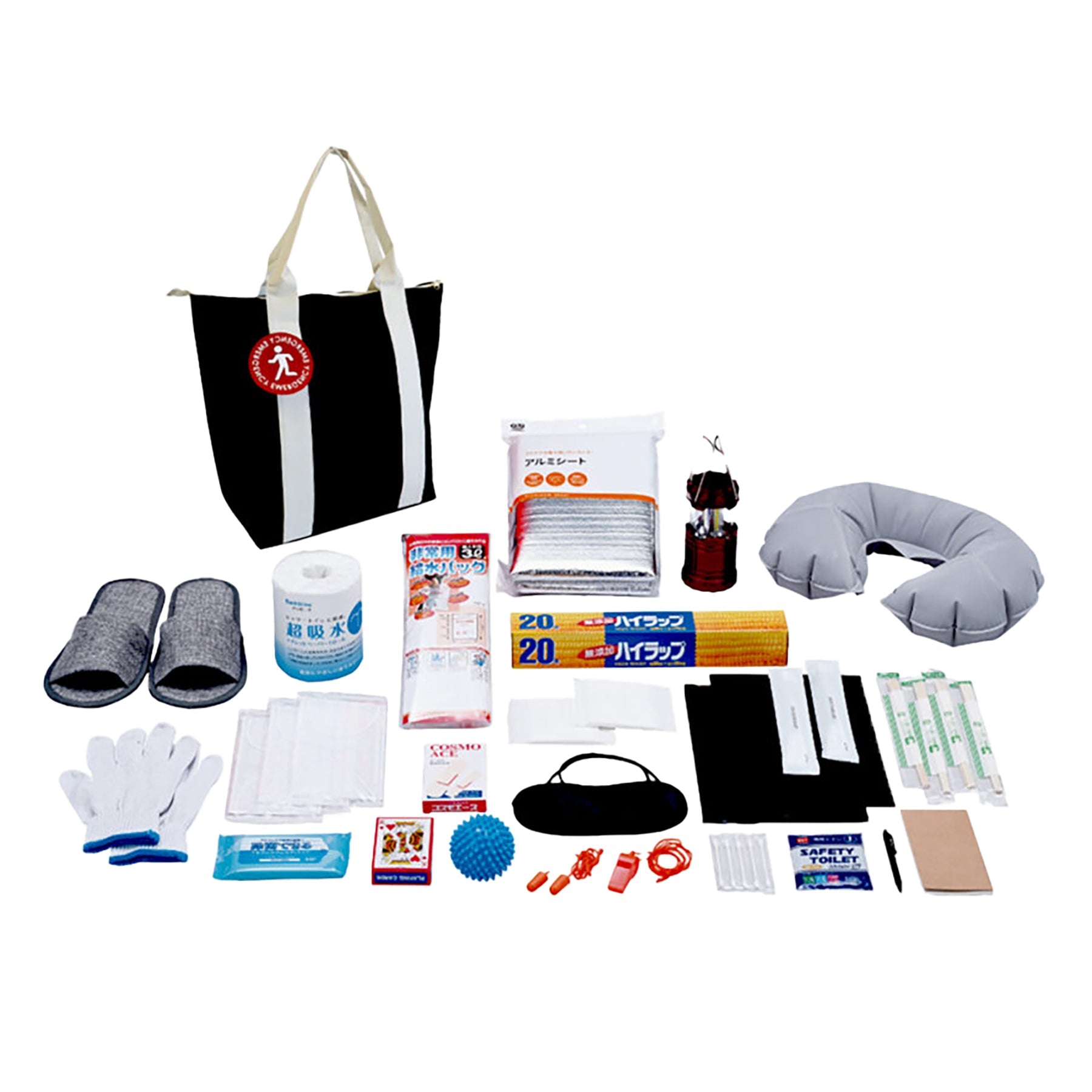 バッグ本体、タンク、ラップ、割りばし4本、マッサージポール、トランプ、マスク3枚、ウェットティッシュ、簡易トイレ1個、トイレットペーパー1R、絆創膏、歯ブラシ2本、綿棒5本、生理用品、レジャーアルミシート、ネックピロー、アイマスク、耳栓、軍手、スリッパ、ゴミ袋2枚、メモ帳、ボールペン、笛、スライドランタン |