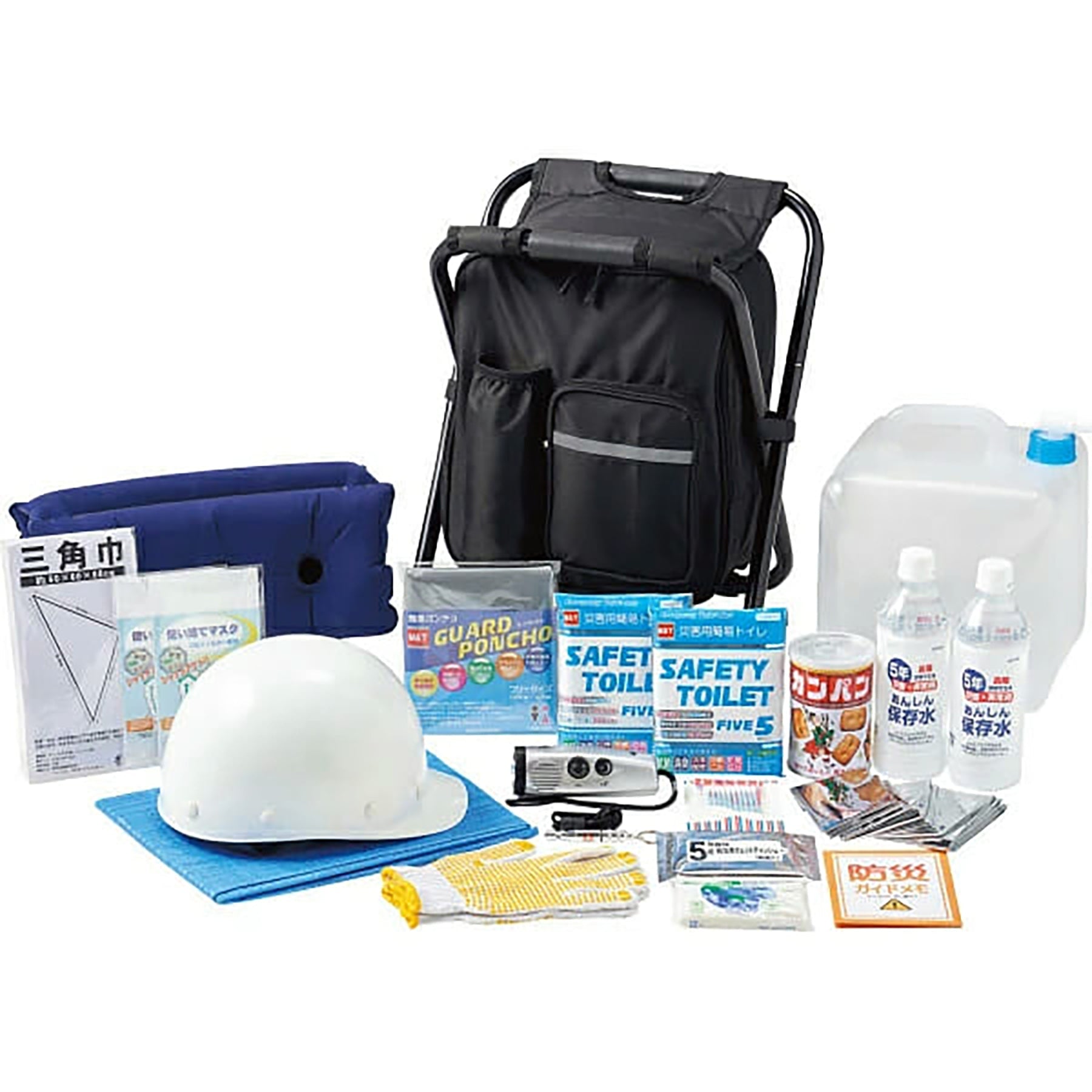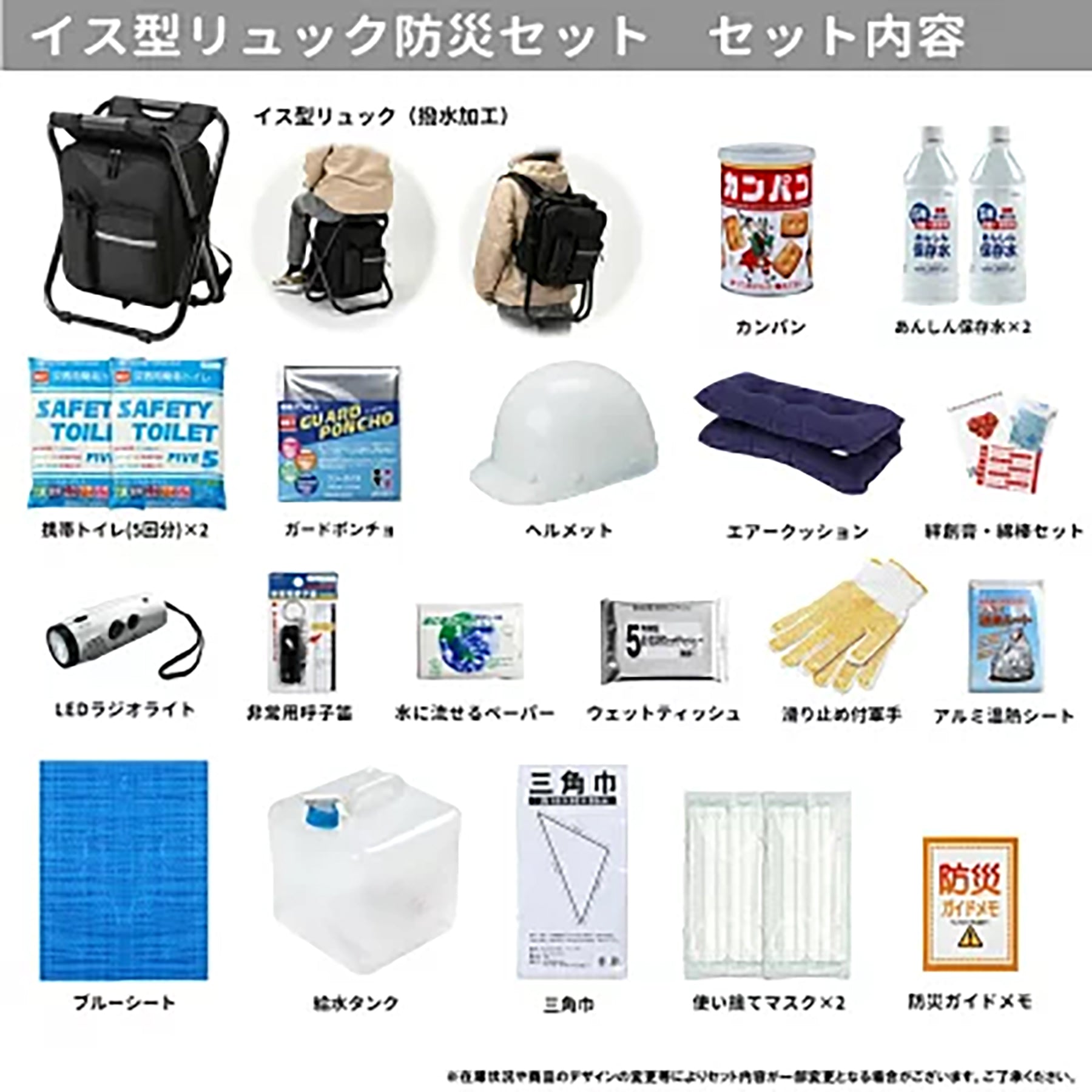 イス型リュック(撥水加工)、ヘルメット、LEDラジオライト(AM/FM)、あんしん保存水内容量500ml×2本、カンパン内容量100g、エアークッション、ウォータータンク(10L)、三角巾、使い捨てマスク×2枚、絆創膏・綿棒セット、水に流せるポケットティッシュ、ウェットティッシュ(5年保存)、アルミ温熱シート、携帯トイレ(5回分)× 2個、非常用呼子笛(IDカード付き)、滑り止め加工付き軍手、防災ガイドメモ、ブルーシート、ガードポンチョ |