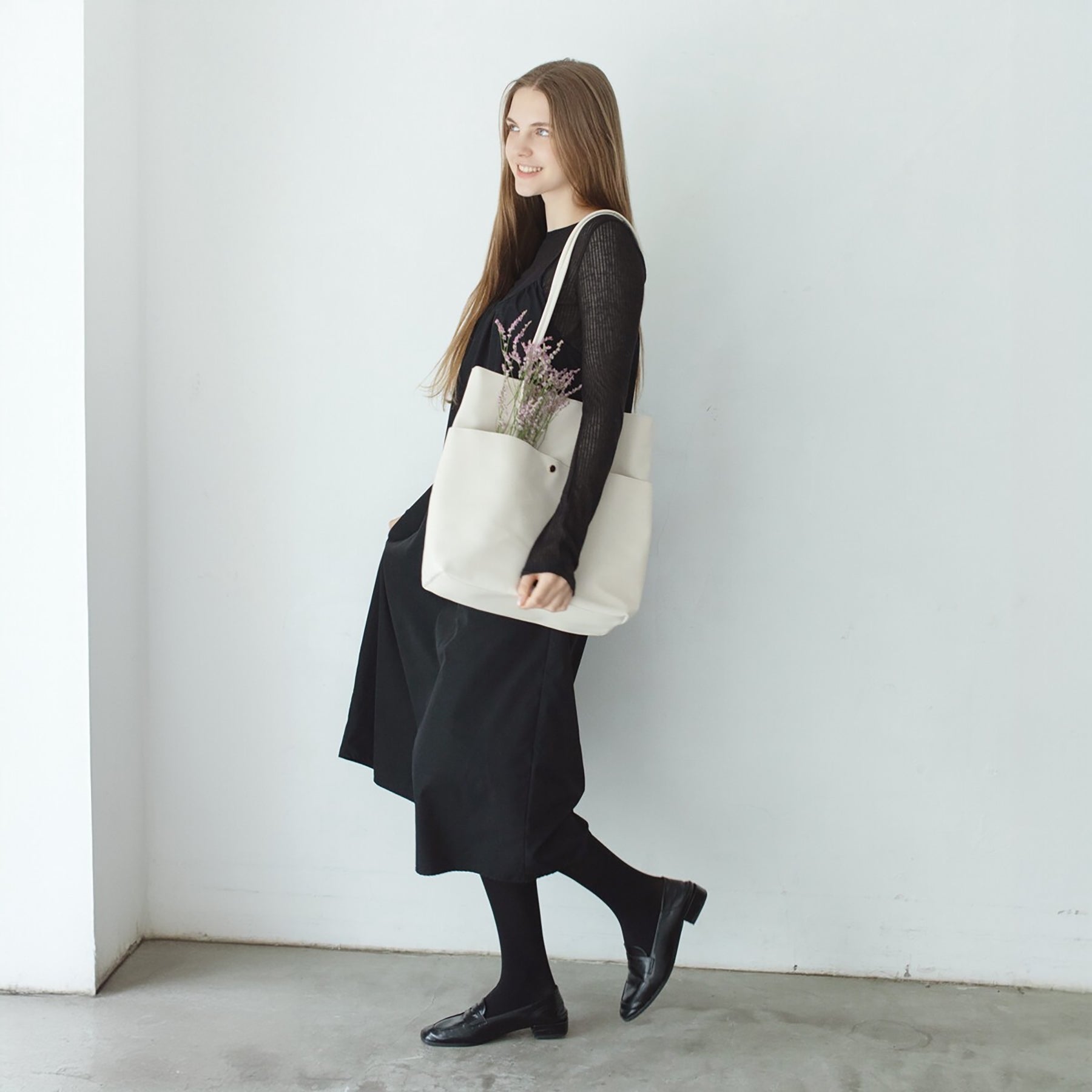 合皮シンプルタックトートバッグは、クッタリ感がかわいい、A4サイズがすっぽり入る万能トートバッグです。