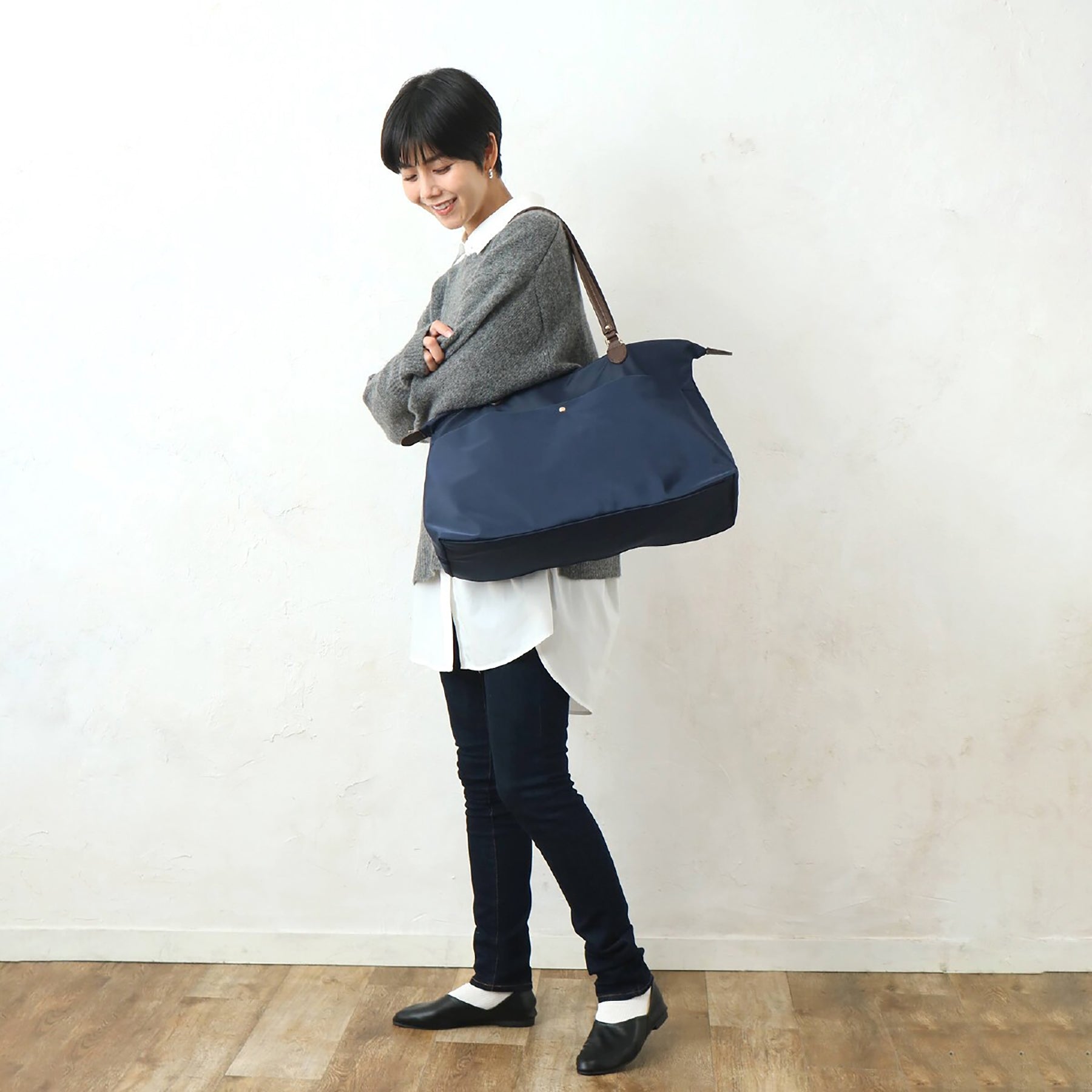 コンビボストンは、細かいシボ感がある合皮と光沢のあるポリ生地を使用したキャリーオン仕様のボストンバッグです。