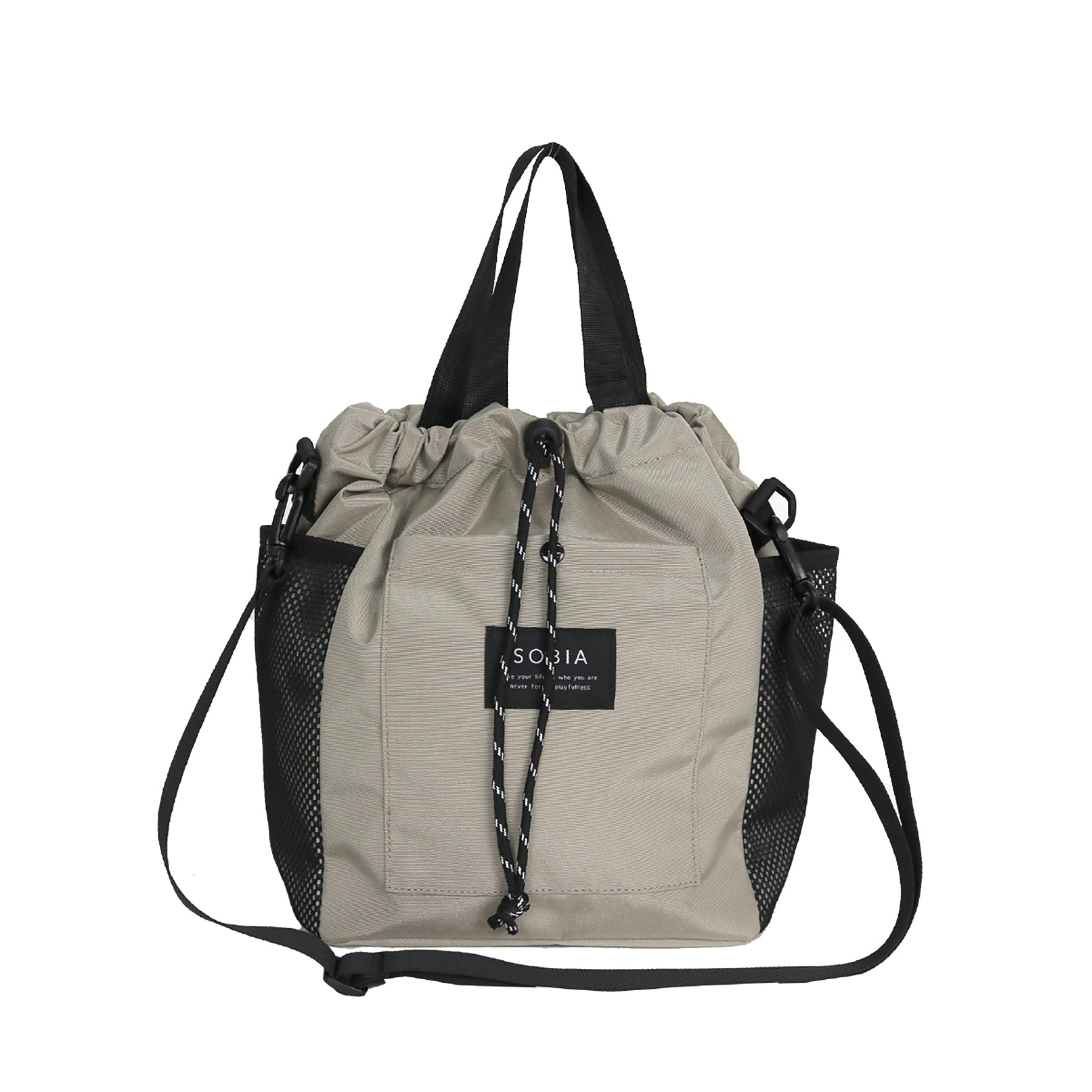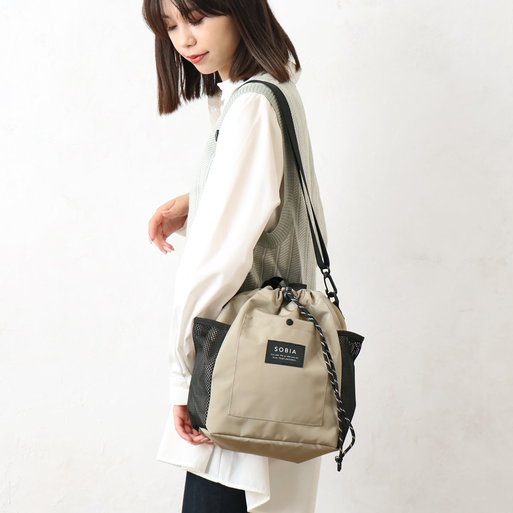 メッシュポケットドロストショルダーは、マチ幅もあるのでお弁当などもしっかり収納できる大容量のショルダーバッグです。
