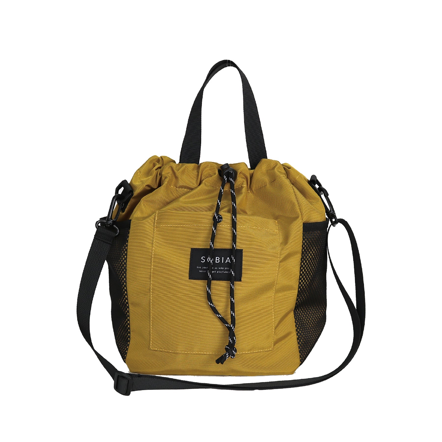 メッシュポケットドロストショルダーは、マチ幅もあるのでお弁当などもしっかり収納できる大容量のショルダーバッグです。
