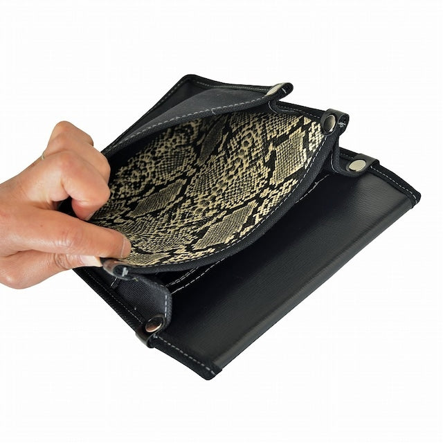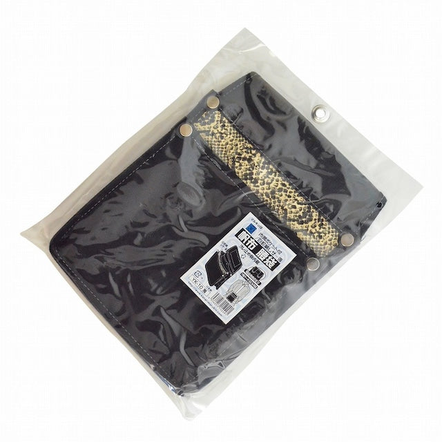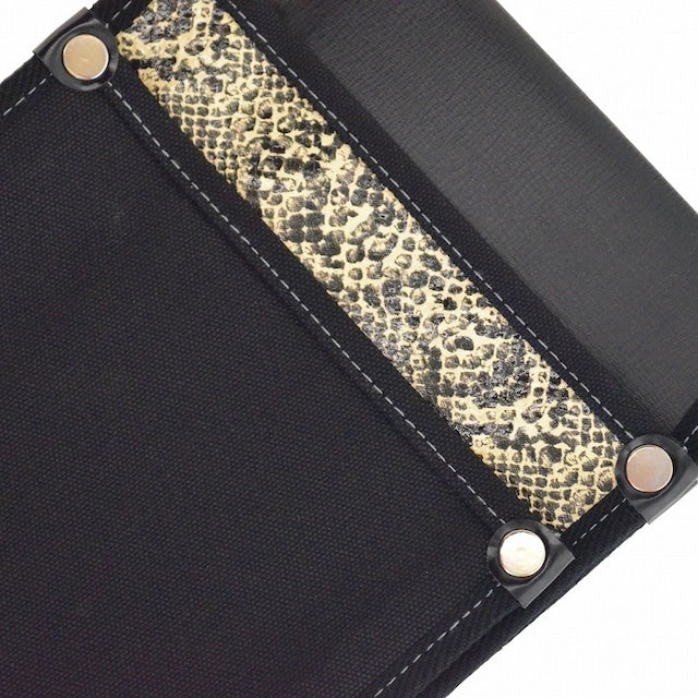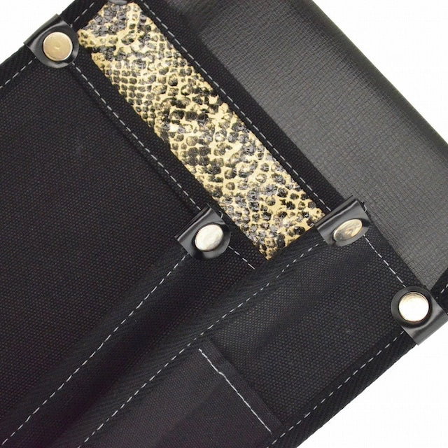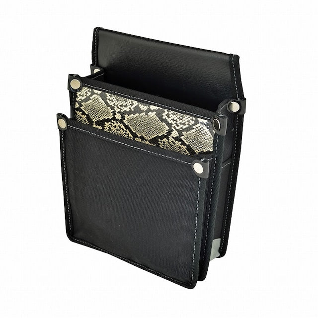 『内側ポケット付帆布/白蛇柄 YK-10 黒』は、腰袋の一部分をレザーの白蛇柄にした、しっかりとした厚みのある腰帆布製の2段タイプの腰袋です。