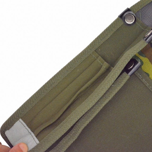 『内側ポケット付帆布/国防迷彩柄 YK-18 黒』は、腰袋の一部分を国防迷彩柄布張りにした帆布製の腰袋です。