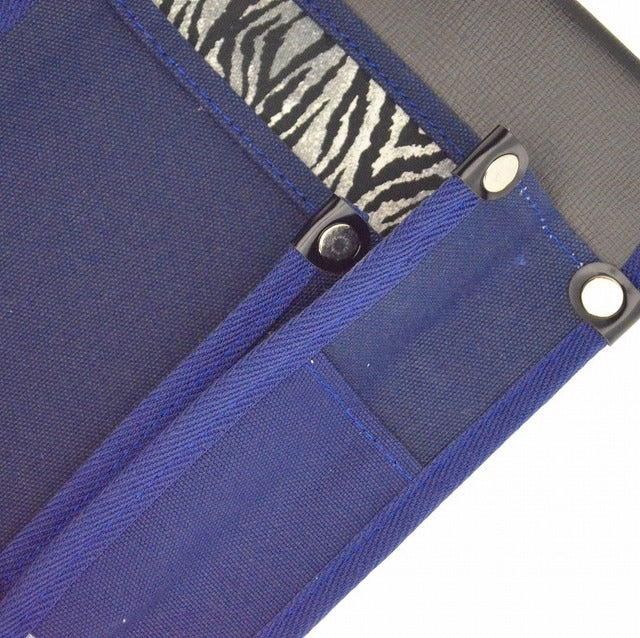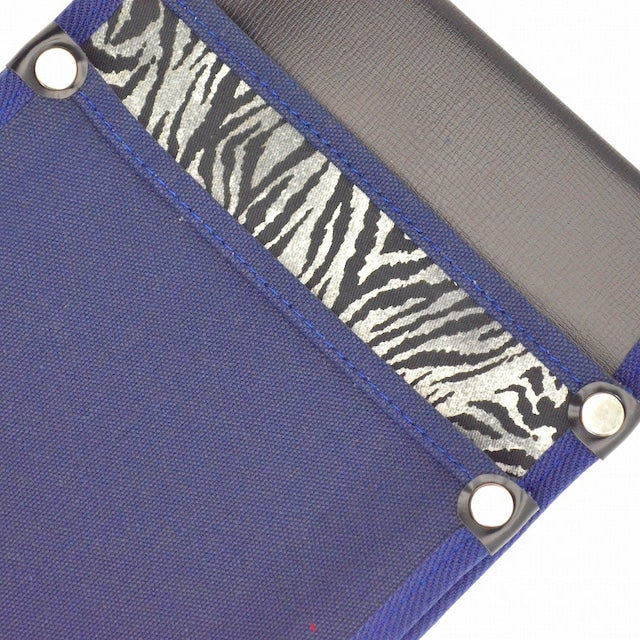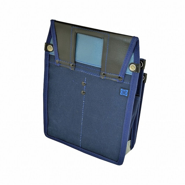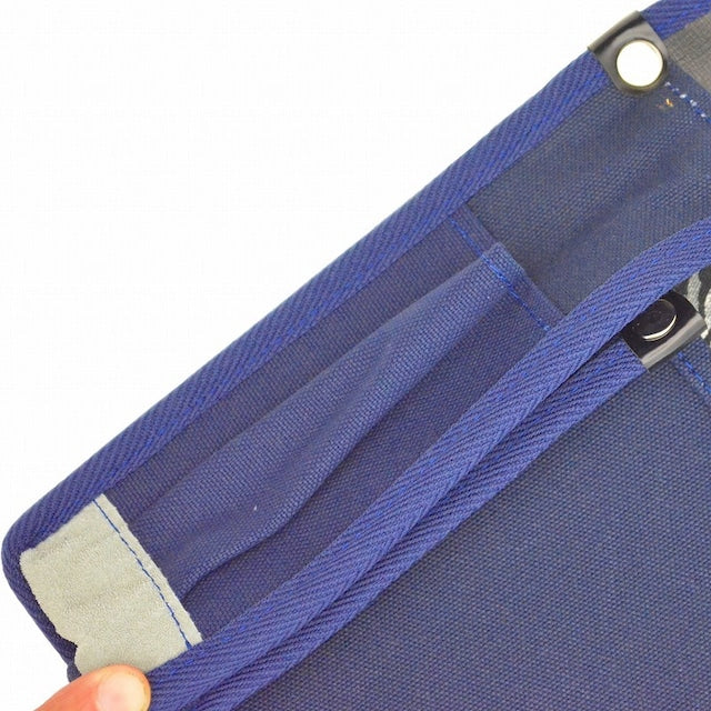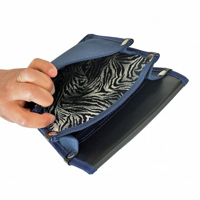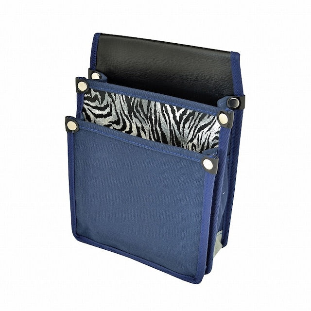 『内側ポケット付帆布/灰虎柄 YK-21 紺』は、腰袋の一部分を灰虎柄布張りにしたしっかりとした厚みのある腰帆布製の2段タイプの腰袋です。