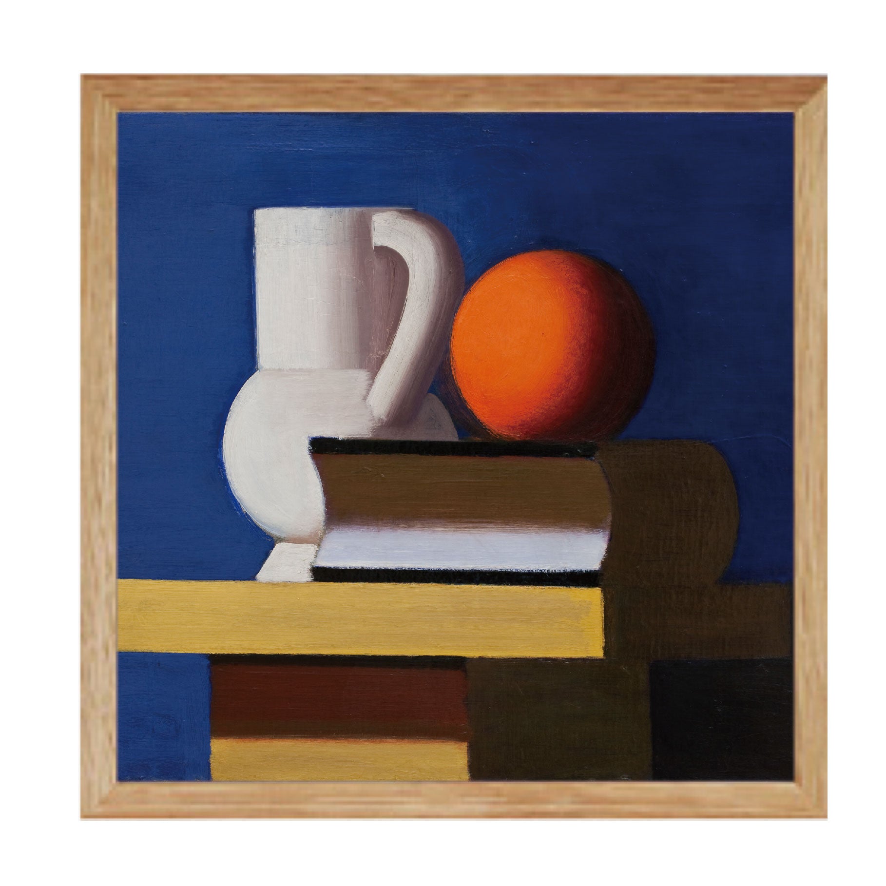 Opstilling med hvid kande, appelsin og bog |