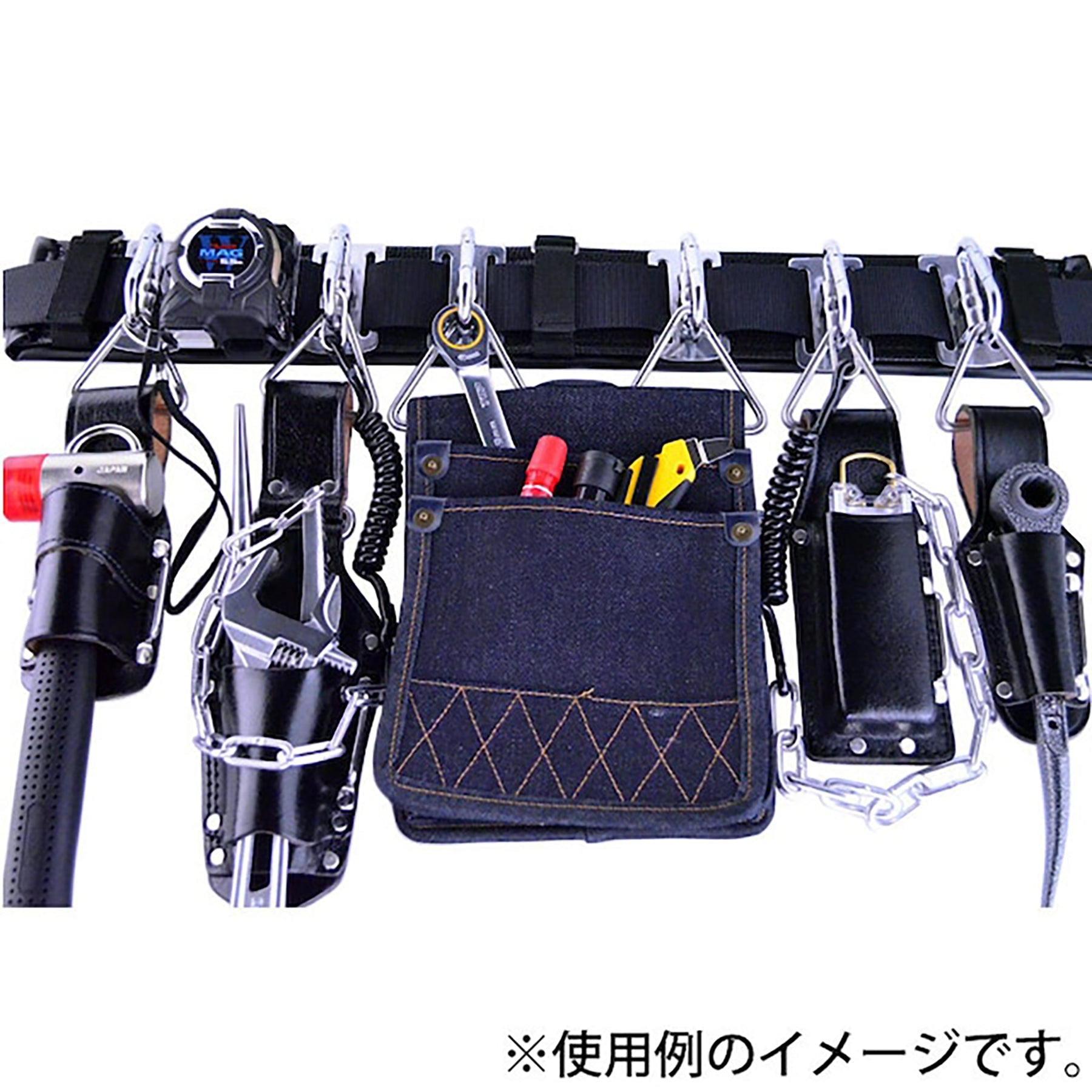 工具差しや腰袋などのベルト通し部に通すことで、カラビナ工具差し等に装着できるようになり、腰道具への着脱が楽になります。