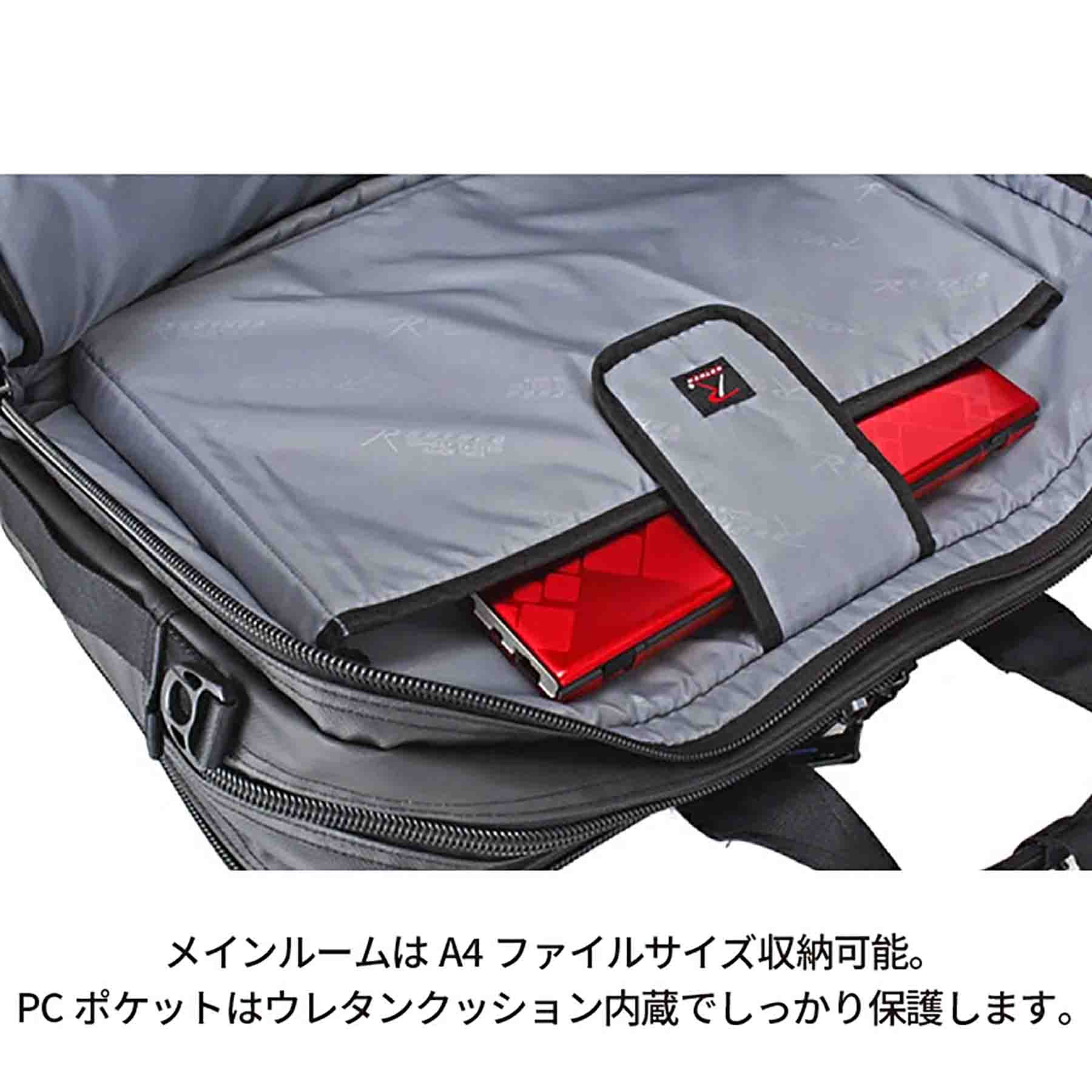 メインルームはA4ファイルサイズ収納可能、PCポケットはウレタンクッション内蔵でしっかり保護します。