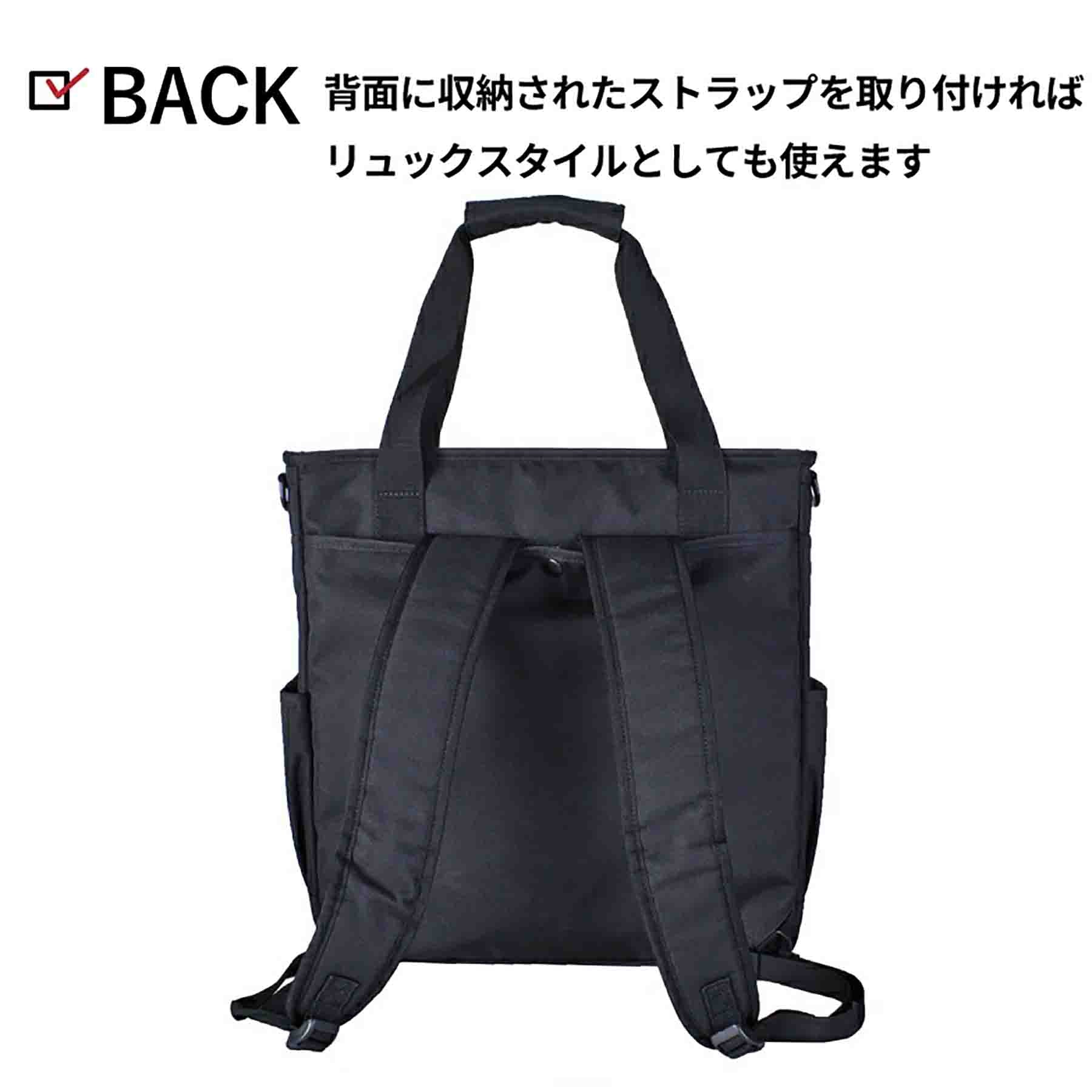 背面に収納されたストラップを取り付ければリュックスタイル、ショルダーストラップを付ければ肩掛けも可能な3wayスタイルです。