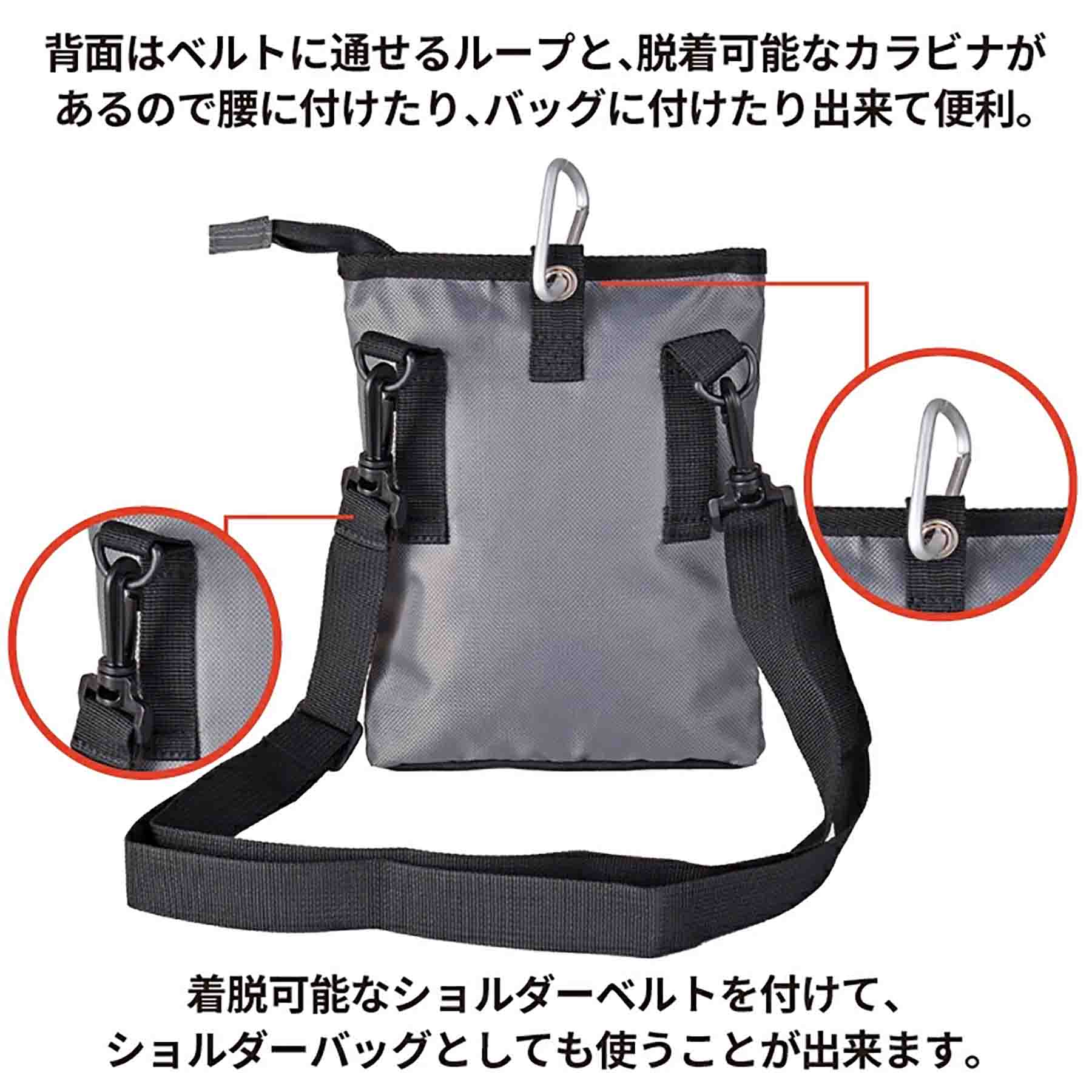 本体背面はベルトに通せるループと、脱着可能なカラビナがあるので使い分けが可能で腰に付けたり、バッグに付けたり、ショルダーベルトで肩から掛ける事ができます。