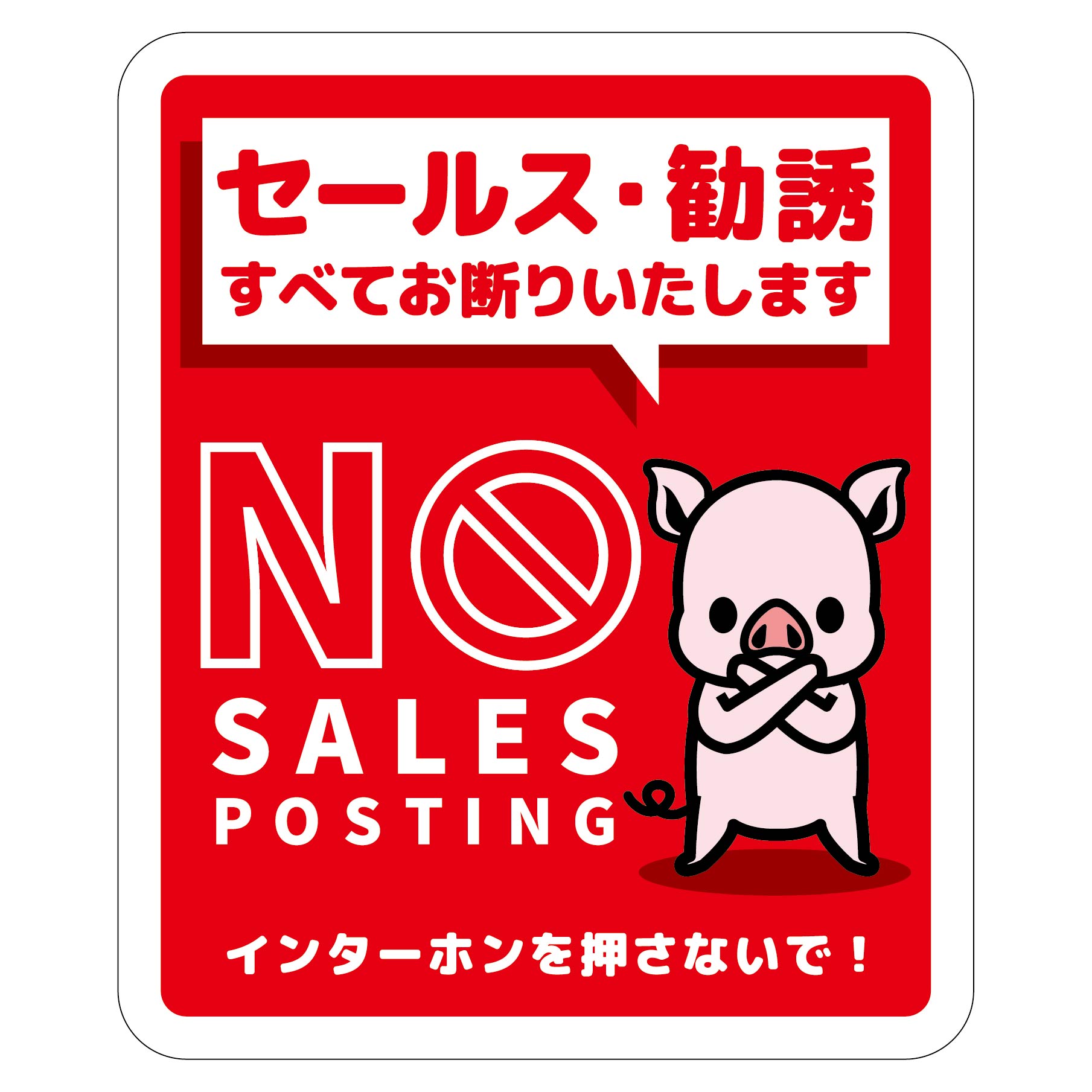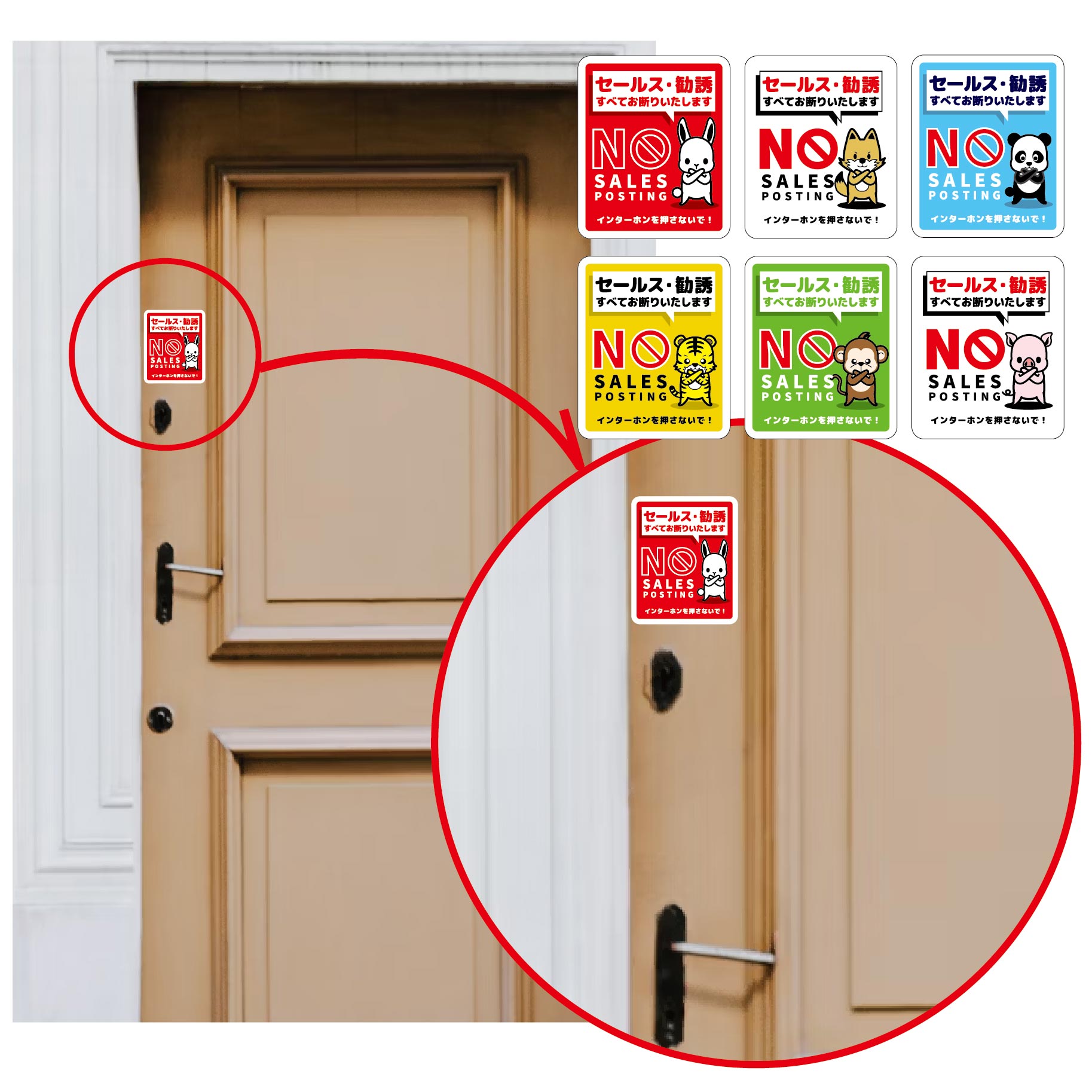 セールスお断り標識、しつこい訪問販売や勧誘などの迷惑なセールスをお断りしてくれる標識です。赤ちゃんやペットがいて、インターホンを鳴らされたくない場合にもオススメです。訪問販売の相談は、電話勧誘販売と並んで最も多い現状にあり、多発する訪問販売被害を防止するのに効果的です。 景観を損ねることなく、様々な箇所に取り付けて注意を促せます。ステッカータイプ、マグネットタイプ、塩ビタイプなど、多種素材デザインでバリエーション豊富です。