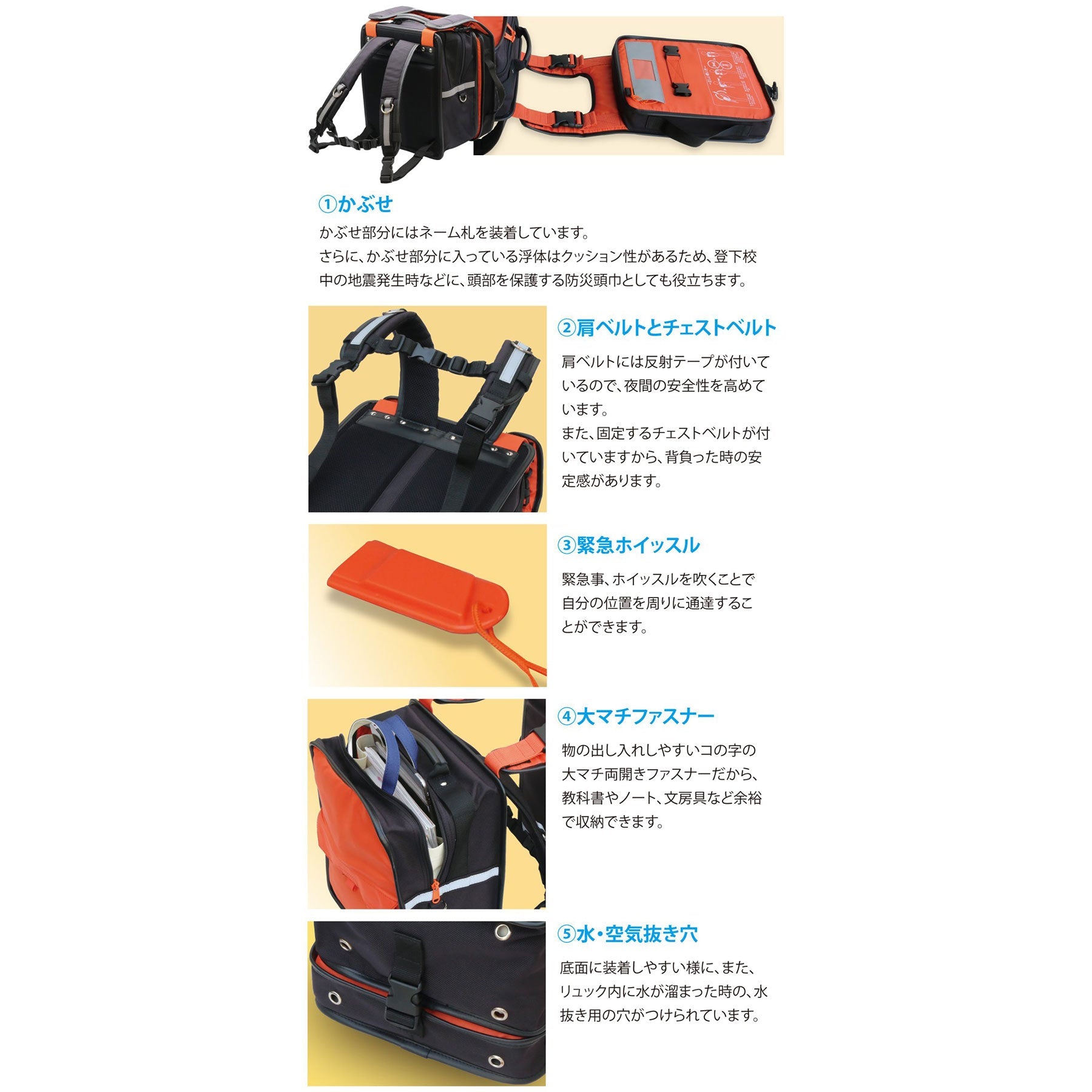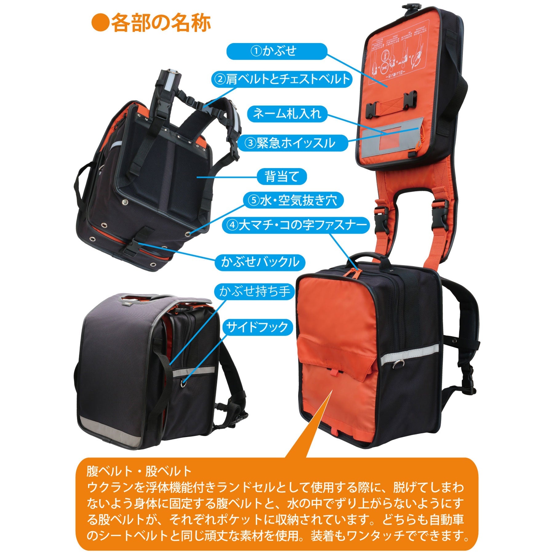 ●ランドセルに万一の水難への備えとなる浮体機能をプラスした「水に浮くランドセル」です。