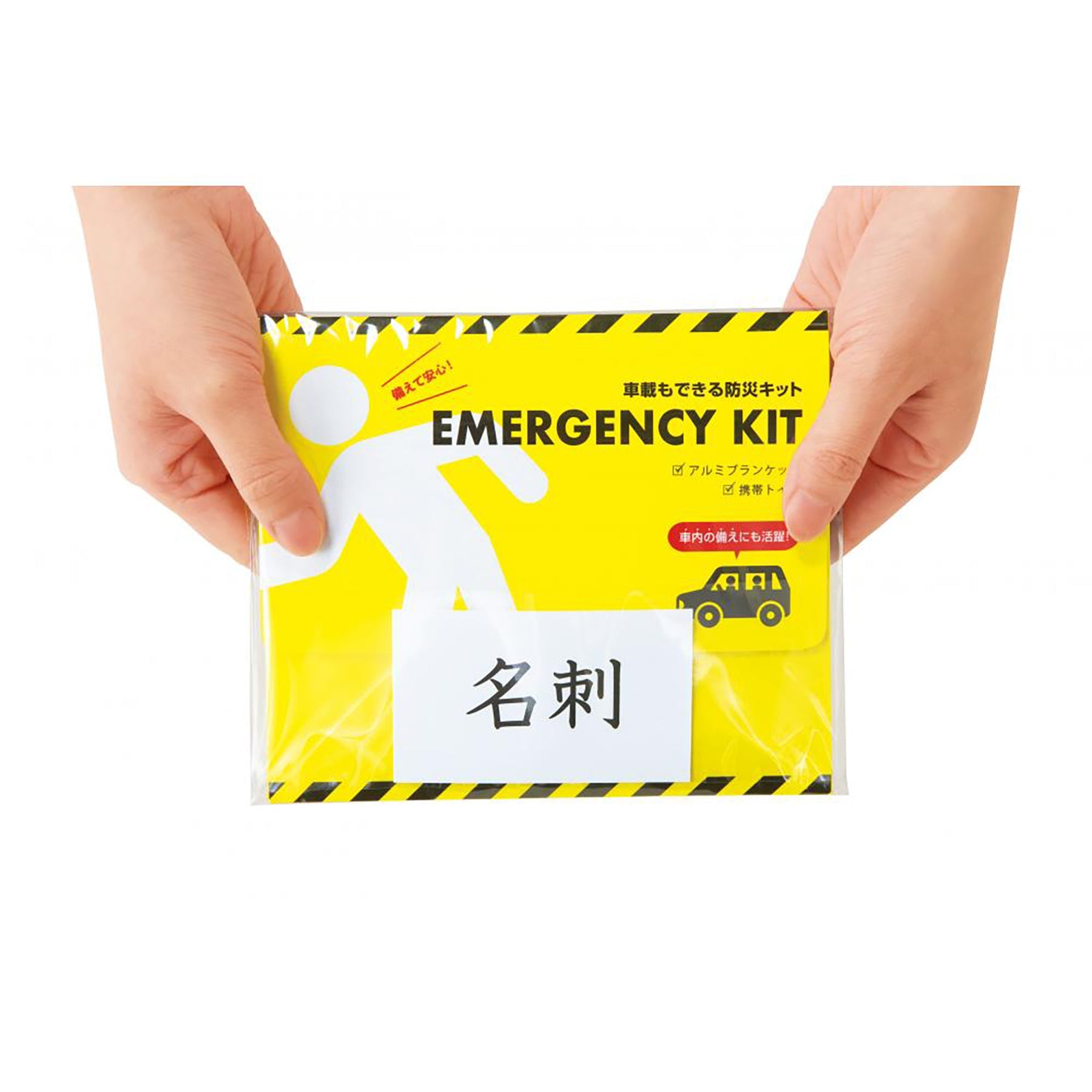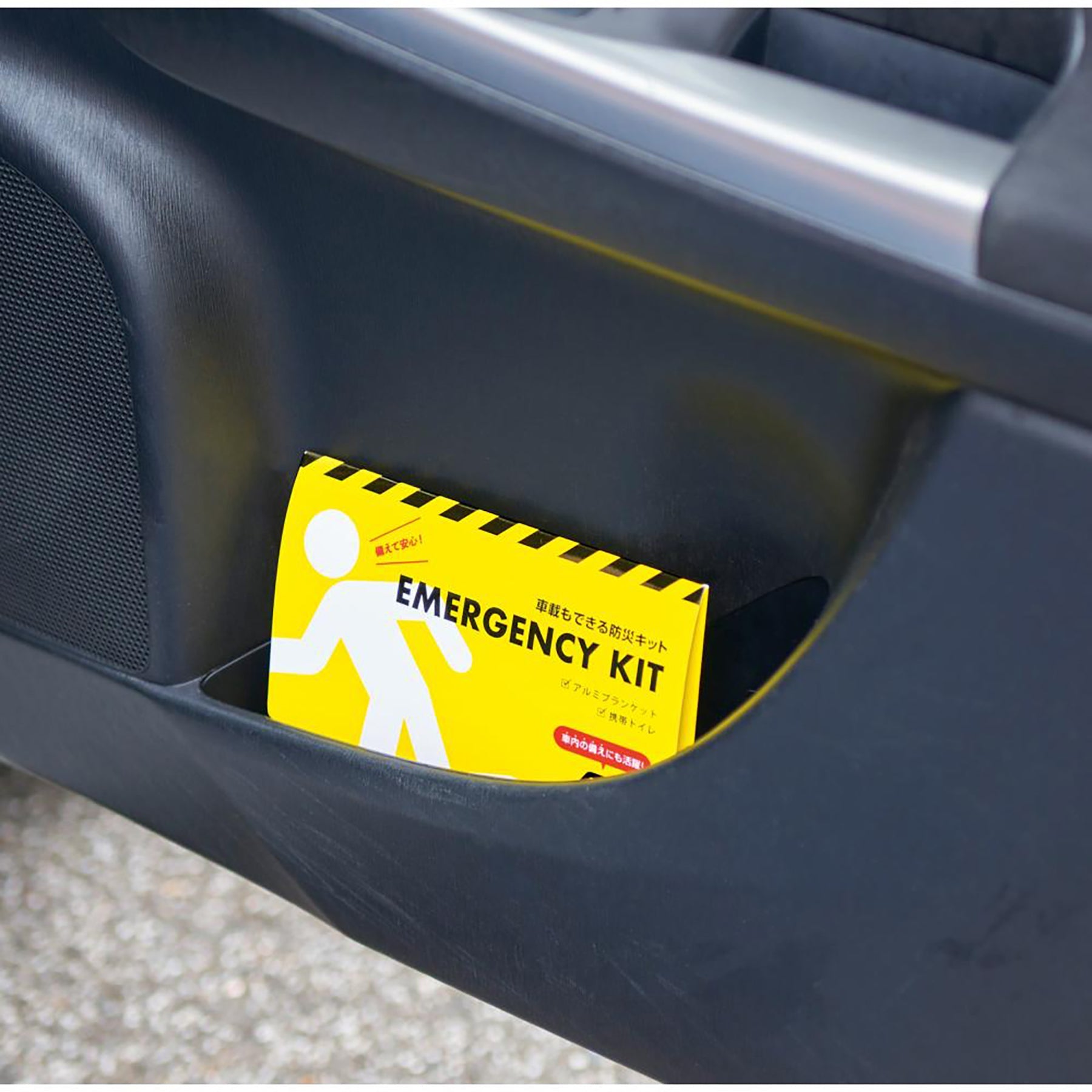 渋滞や非常時に備えて車に常備できる薄型パッケージ入りの携帯トイレとアルミブランケットの防災キットです。