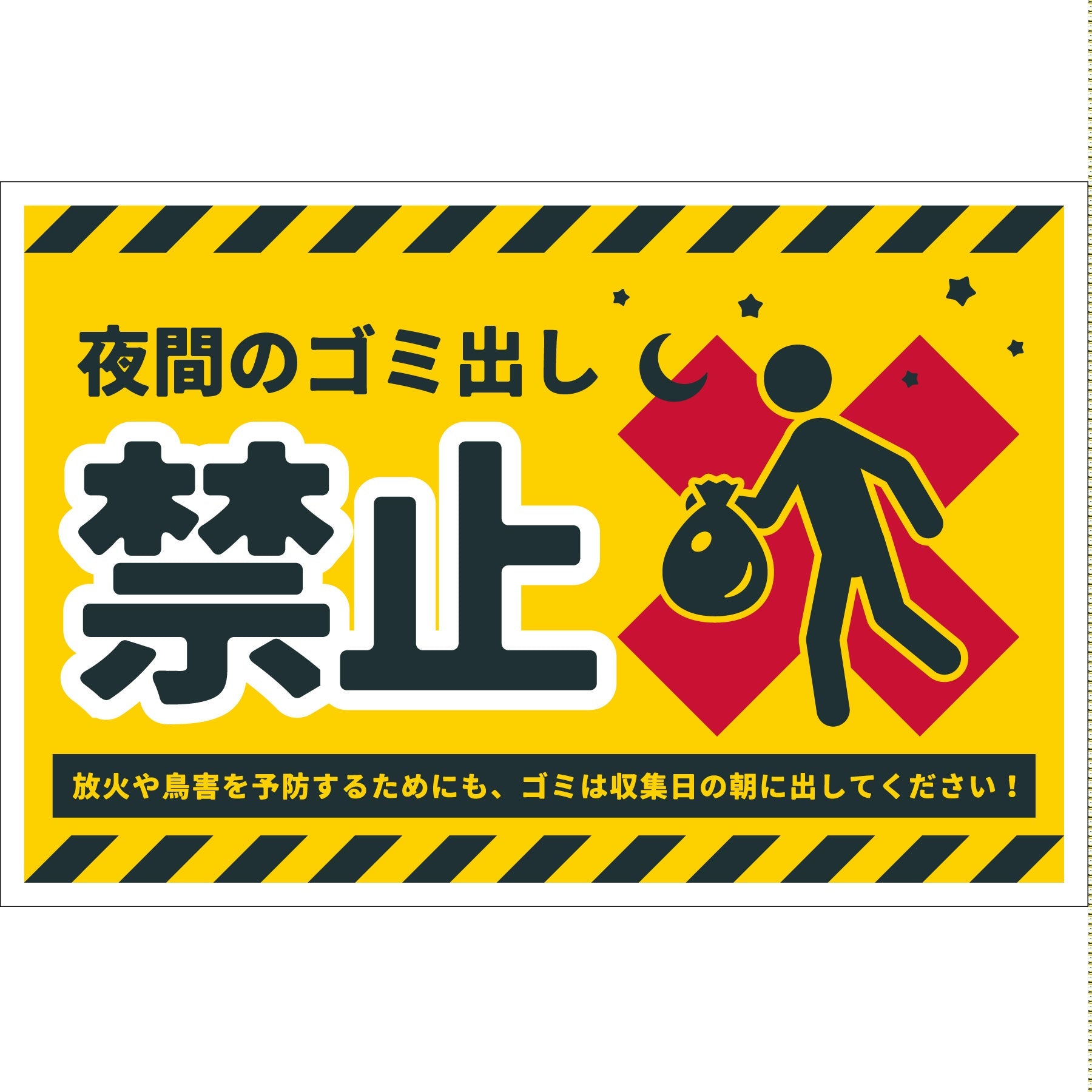 シンプルでわかりやすいマンガ標識です。夜間にゴミを捨てると、カラスなどに荒らされたり放火などの犯罪に繋がる可能性があるため、それらへの注意喚起となります。様々な箇所に取り付けて注意を促せます。
