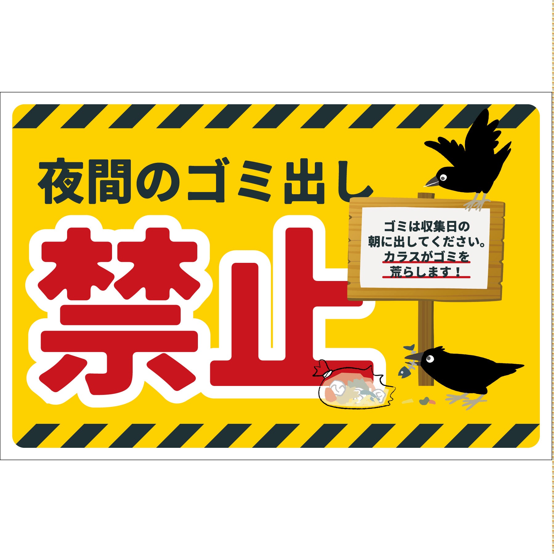 シンプルでわかりやすいマンガ標識です。夜間にゴミを捨てると、カラスなどに荒らされたり放火などの犯罪に繋がる可能性があるため、それらへの注意喚起となります。様々な箇所に取り付けて注意を促せます。