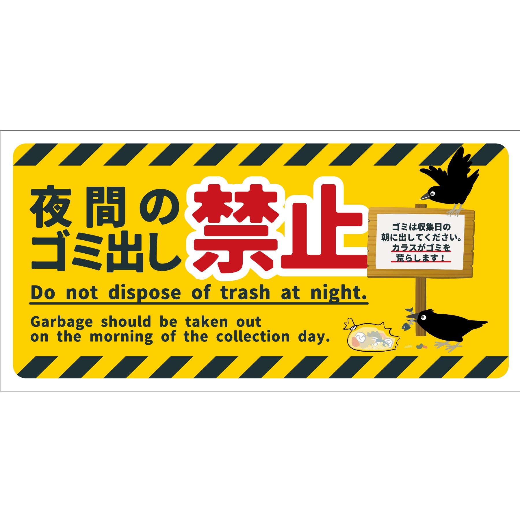 シンプルでわかりやすいマンガ標識です。夜間にゴミを捨てると、カラスなどに荒らされたり放火などの犯罪に繋がる可能性があるため、それらへの注意喚起となります。様々な箇所に取り付けて注意を促せます。