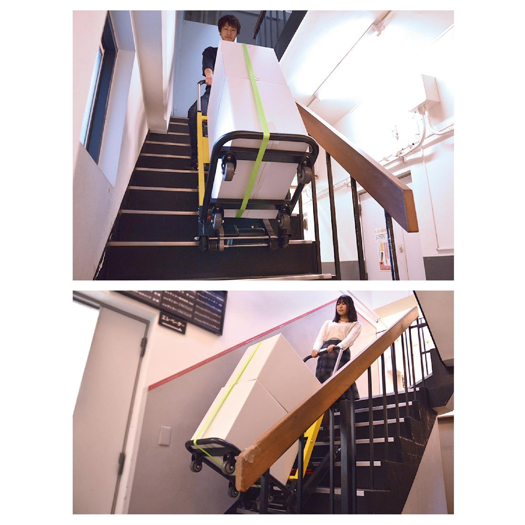 中型サイズの手押し台車の背面に、階段を昇り降りできる電動の走行ベルトと、運搬を安定させる伸縮するハンドルがついています。