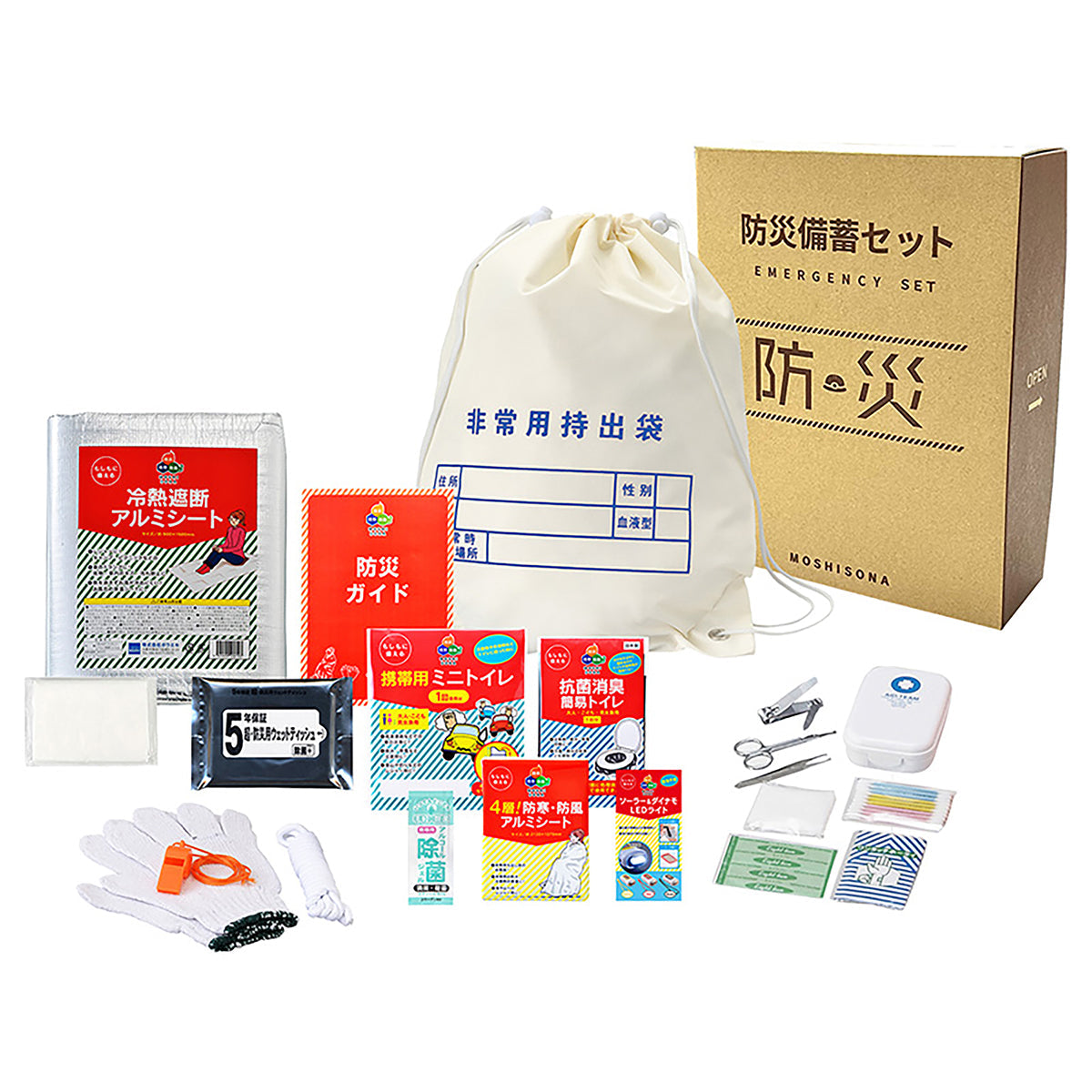 ①難燃性de持出袋、②防災ガイド、③冷熱遮断アルミシート、④抗菌消臭・簡易トイレ、⑤携帯用ミニトイレ、⑥ 防災用ウェットティッシュ(20枚入)、⑦ポケットティッシュ、⑧新ソーラー&ダイナモLEDライト(3色アソート)、⑨4層!防寒・防風アルミシート、⑩除菌ジェル、⑪軍手、⑫ロープ、⑬笛、⑭絆創膏5枚、⑮綿棒10P、⑯コットンパフ3P、⑰ワンタッチ包帯、⑱爪切り、⑲毛抜き、⑳ハサミ |